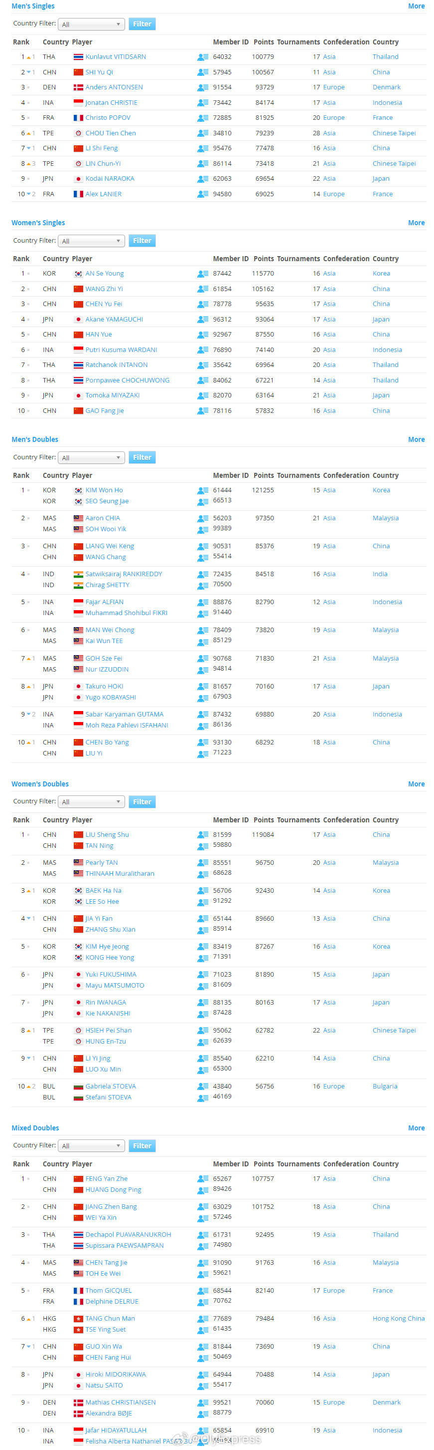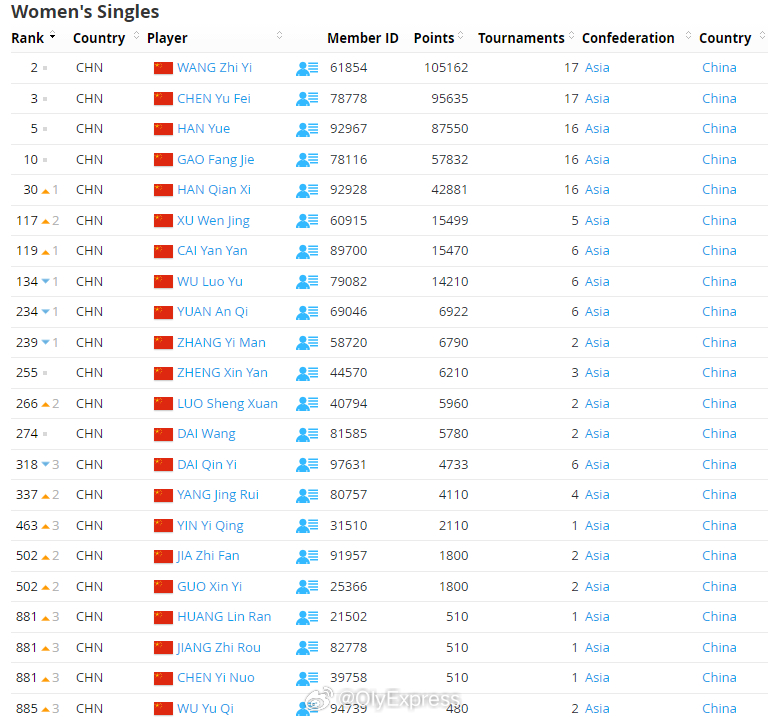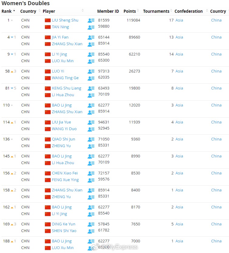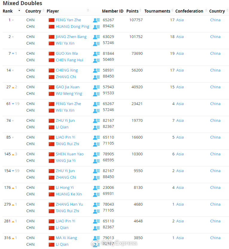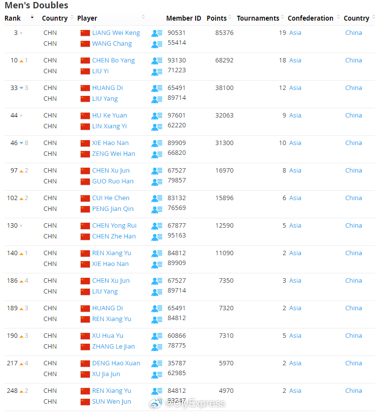 【世界羽联排名0310:石宇奇跌下王座】世界羽联排名2026年瑞士羽毛球公开赛3月10日,世界羽联公布了最新一期羽毛球选手世界排名。全英赛首轮出局的石宇奇跌下男单世界第一宝座,泰国昆拉武特取而代之。国羽详细排名:男单石宇奇2、李诗沣7、翁泓阳16、陆光祖18、王正行26、胡哲安62、董天尧66、朱轩辰70;女单王祉怡2、陈雨菲3、韩悦5、高昉洁10、韩千禧30;男双梁伟铿/王昶3、陈柏阳/刘毅10、胡珂源/林祥毅44;女双刘圣书/谭宁1、贾一凡/张殊贤4、李怡婧/罗徐敏9、罗意/王汀戈58、鲍骊婧/罗徐敏188、李怡婧/王漪朵209;混双冯彦哲/黄东萍1、蒋振邦/魏雅欣2、郭新娃/陈芳卉7、程星/张驰14、高家炫/吴梦莹27、朱一珺/李茜74。