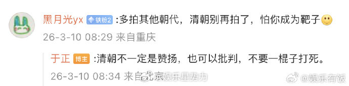 于正谈对清朝剧的看法于正 不要一棍子打死清朝剧 于正晒出自己阅读历史书籍的日常,被粉丝在线劝别再拍清朝剧,他直接回应,清朝剧不只有赞扬,也可以有批判,不该一棍子打死。