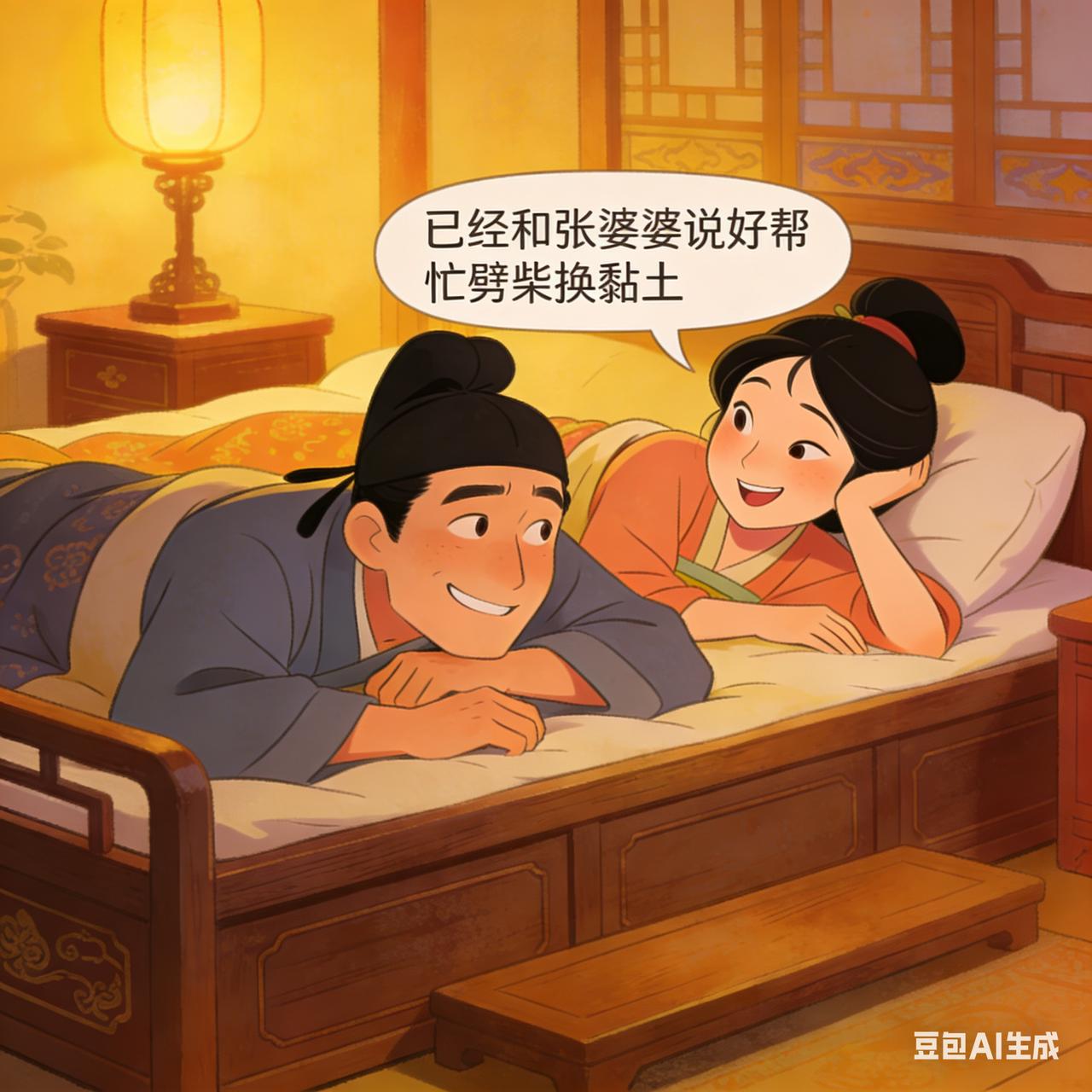 古代夫妻搞笑段子 有对夫妻刚成亲不久,夜里丈夫翻来覆去睡不着,妻子问:“你咋还不睡?”丈夫叹道:“我在想,咱往后日子该咋过。”妻子笑:“这有啥难的?你耕田我织布,过两年添个娃,不就挺好?” 丈夫却眉头皱得更紧:“可咱家那亩水田,去年被山洪冲了个豁口,开春得先修田埂。我瞅着那豁口得用三车黏土才填得上,咱家存的那点,够不够还两说。” 妻子伸手把他脑袋按回枕头上:“前儿我去村西头找张婆婆借针线,见她家柴房堆着半车黏土,说是冬天垫猪圈剩下的。我跟她说好了,等开春咱帮她劈三捆柴,那黏土就归咱。” 丈夫眼睛刚亮起来,又耷拉下去:“那织布的线呢?去年收的棉花,弹出来的絮子够织两匹布不?我瞅着隔壁二丫出嫁,她娘给她陪了五匹,咱要是只织两匹,往后给娃做衣裳都不够……” “你这脑子咋净想些没用的!”妻子拧他胳膊一下,“我早跟东头李婶换了半斤麻线,她教我掺在棉线里织,又结实又省料,两匹布能顶三匹用。再说了,等秋收了,咱多留些棉花不就成了?” 丈夫这下没话说了,乖乖躺好,可没过片刻又支支吾吾:“那……添娃的话,得给娃做个小摇篮吧?我瞅着后山那棵柳树,枝条够编个结实的……” 妻子抬腿就往他屁股上踹:“再叨叨摇篮,明儿就让你抱着柴刀去柳树下睡!”