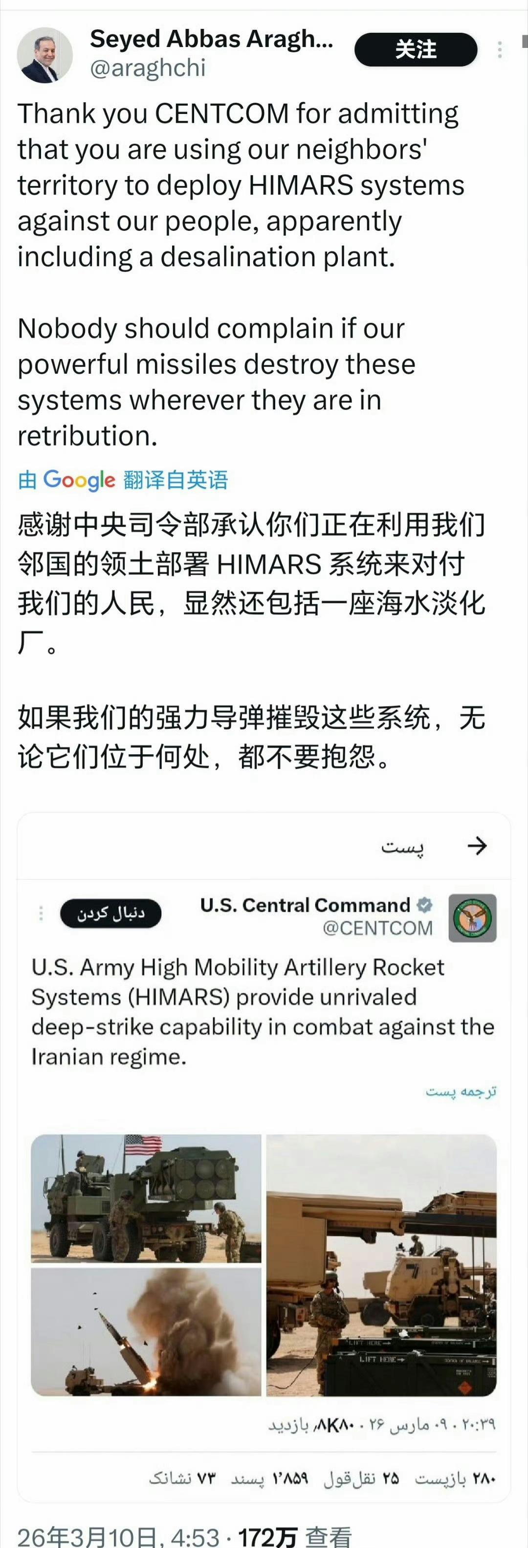 伊朗外长:如果我们的强力导弹摧毁这些系统,无论它们位于何处,都不要抱怨。 美国中央司令部:美国陆军“海马斯”(HIMARS)高机动性多管火箭炮系统,在针对伊朗政权的作战中提供了无与伦比的纵深打击能力。 伊朗外长阿拉格奇发文回应:我感谢美军中央司令部承认,他们利用我们邻国的领土部署“海马斯”系统,并向我国人民发射短程导弹——显然,针对格什姆岛水处理厂的袭击也包含在内。 如果我们的强力导弹摧毁这些系统,无论它们位于何处,都不要抱怨。