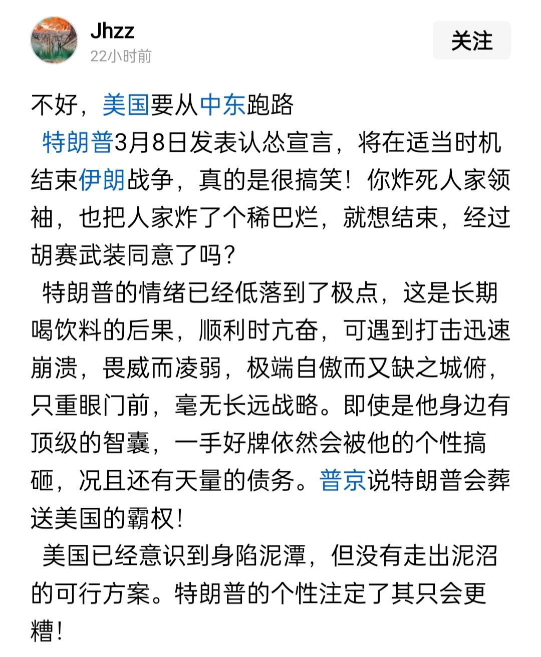 美帝为集中精力对付东大,不敢深陷伊朗泥潭致国力崩溃,这正是近日我最担心的事情。可越担心什么,就越来什么,本以为特朗普作为美帝非主流派,不撞南墙死不回头,炸死哈梅内伊及一众伊朗高层后,还会不顾巨额财政赤字,加派地面部队实施进攻。可这老狐狸确实撑不住了,为给自己留一点体面,竟称将会适时结束战争,又为美帝延寿些年头。可恨!难道老天认为美帝气数还未尽吗?