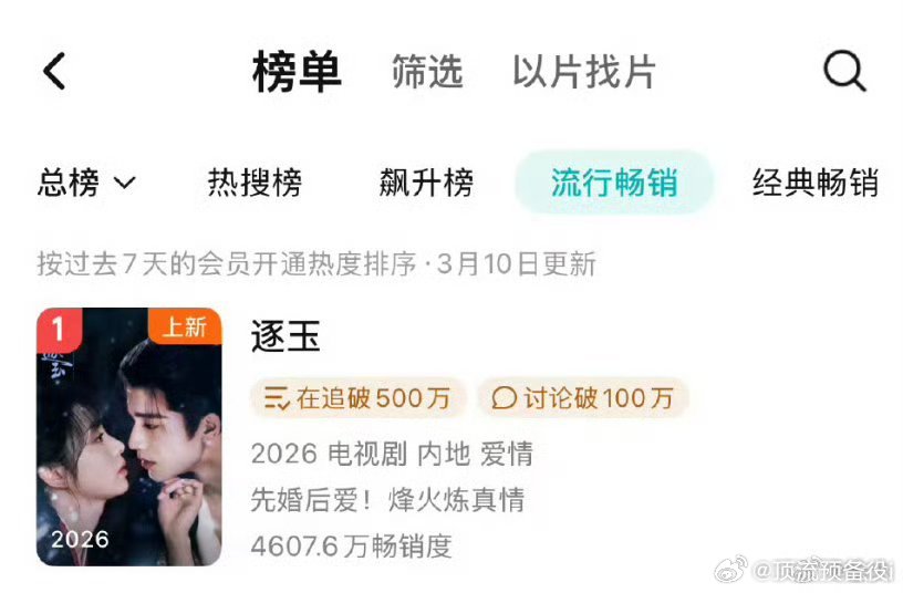 张凌赫田曦薇逐玉拉新周榜登顶 开播第四天,逐玉成绩持续刷新,正式进入腾讯拉新周