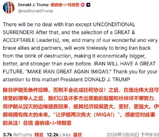 前几天,前国务卿布林肯做了个大胆预测。他在接受彭博社采访的时候说,特朗普为了草草收场,很可能会单方面宣布“美国已经获胜”。 当时很多人觉得,这不过是政敌之间的互相抹黑。毕竟仗正打着,伊朗那边还在还手,第26轮、27轮行动都启动了,美军基地还在挨炸。这时候喊“赢”,谁信? 结果呢?这才过了几天,布林肯的话就应验了。 特朗普放狠话:伊朗必须无条件投降 当地时间3月6号,特朗普在社交媒体上火力全开。他发文说,除了“无条件投降”,美国不会跟伊朗达成任何协议。 可特朗普这狠话刚放出去,就被伊朗用实际行动狠狠打了脸,也更印证了布林肯预测的核心——特朗普所谓的“胜利”,不过是自欺欺人的草草收场。 3月7号一天之内,伊朗就接连发动了第25、26、27轮反击,分工明确得很,一边盯着以色列打,一边追着美军炸,丝毫没给美国留面子。 对着以色列,伊朗直接拿出了法塔赫高超音速导弹,搭配无人机群,精准打击特拉维夫南部指挥中心和海法海军基地,把这两个重要军事目标炸得面目全非,损毁率直接干到90%,还造成几十名以军伤亡。 对着美军,伊朗的无人机和导弹齐上阵,先后炸了巴林、卡塔尔的美军基地,甚至在红海海域击伤了美军梅森号驱逐舰,硬生生把这艘驱逐舰逼得退出部署,更厉害的是,伊朗还公开宣布俘获了5名美军士兵。 可美国五角大楼嘴硬得很,死活不承认,还狡辩说这是伊朗编造的谎言,结果被伊朗最高国家安全委员会秘书当场戳破,直言美方就是怕丢面子,才故意谎称这些士兵已经阵亡,场面别提多尴尬了。 这时候再看特朗普那句“伊朗必须无条件投降”,就显得格外讽刺,说白了就是布林肯说的“草草收场”,只不过换了个狠话说出来,给自己找个体面的台阶罢了。 毕竟美国现在是真的耗不起了,3月8号美军中央司令部被迫官宣,截至当天,美军在冲突中已经阵亡7人、重伤18人,这是美伊冲突爆发以来伤亡最惨重的一天,之前美军嘴硬说的“轻微损失”,彻底被戳穿得明明白白。 而原本跟着自己的中东盟友,现在也开始明哲保身,沙特、科威特、阿联酋这些国家,纷纷拒绝美军使用他们的军事基地去打击伊朗,相当于直接断了美军在中东的前沿支点,美军的军事行动一下子就陷入了被动,在中东的军事脆弱性也彻底暴露无遗。 特朗普心里其实跟明镜似的,他比谁都清楚,继续打下去,美国只会损失更多——武器库库存告急,先进导弹的生产周期太长,根本跟不上消耗速度;盟友纷纷离心离德,没人愿意再跟着美国蹚这趟浑水;国内的反对声音也越来越大,民众不满美军深陷战争泥潭,军费开支飙升,拖累国内经济。 所以他才急着放狠话,逼着伊朗投降,本质上就是想赶紧结束这场消耗战,哪怕只是嘴上宣布“美国获胜”,哪怕伊朗根本不买账,也能给自己挣点颜面,也能堵住国内的反对声音。 而布林肯之所以能精准预测到这一点,就是因为他太了解美国当前的困境,也太了解特朗普的行事风格,知道他遇到搞不定的事情,从来都是靠放狠话装强硬,实在撑不下去就草草收场,对外谎称自己赢了。 现在再回头看,当时大家嘲笑布林肯是政敌抹黑,其实是没看透美国的真实处境,也没看透特朗普的套路。 伊朗这边早就放出话来,他们有能力持续至少六个月的高强度战争,而且还联合了胡塞武装、黎巴嫩真主党等多个抵抗力量,形成了强大的反美阵营,彻底掌握了中东局势的主动权,不管美国怎么放狠话,伊朗都丝毫不会妥协。 反观美国,除了嘴硬和放狠话,根本拿不出有效的应对办法,既不敢轻易发动大规模地面进攻,又无法压制伊朗的持续反击,只能眼睁睁看着自己陷入被动。 特朗普的“无条件投降”,与其说是对伊朗的威胁,不如说是一种无奈的挣扎;布林肯的预测,算不上什么未卜先知,只是看透了美国的消耗困境和特朗普的一贯套路。 特朗普嘴上喊着让伊朗投降,背地里大概率早就想草草结束这场战争,毕竟再耗下去,美国的霸权脸面只会丢得更干净,国内的矛盾也会越来越突出。 毕竟谁都清楚,现在的美国,早就不是那个能在中东说一不二的霸主了,伊朗的持续反击,已经彻底打破了美以在中东的垄断局面,特朗普再怎么放狠话,也改变不了美国陷入被动的事实,而布林肯的预测,不过是提前点破了这层窗户纸而已。 说到底,特朗普的狠话,不过是自欺欺人,布林肯的预测,不过是实话实说,这场看似嚣张的威胁,背后全是美国的力不从心。
