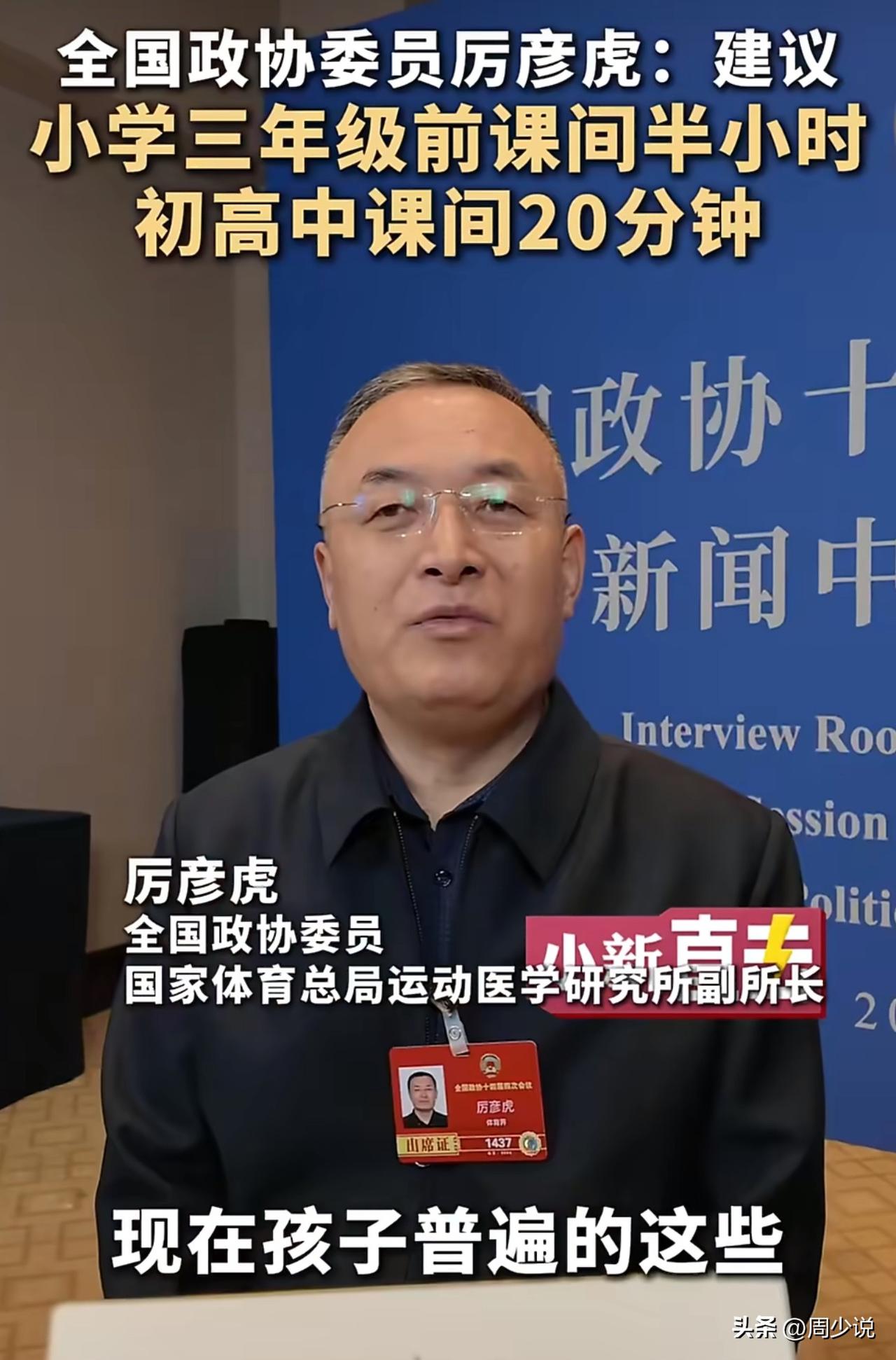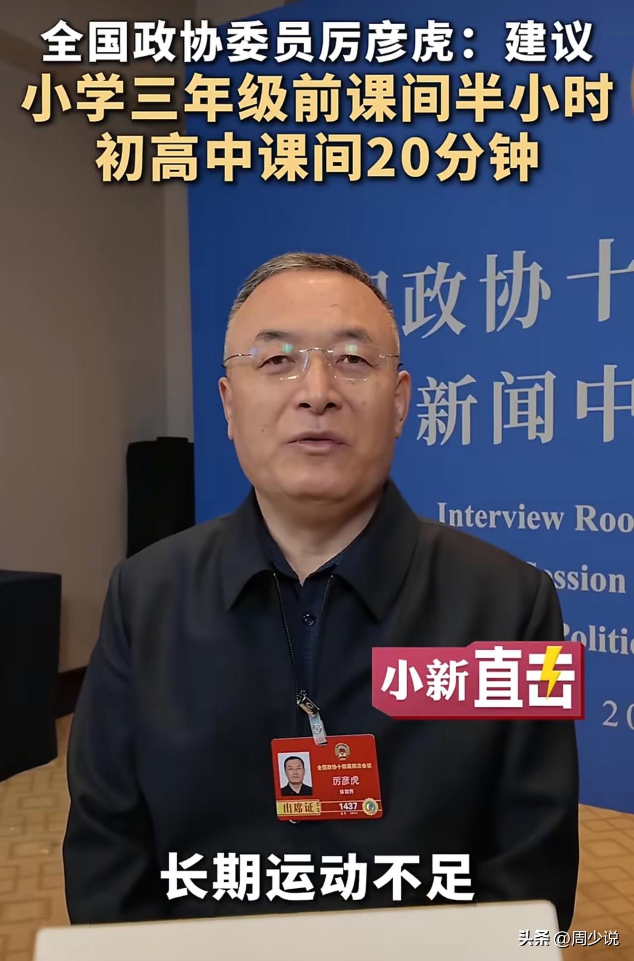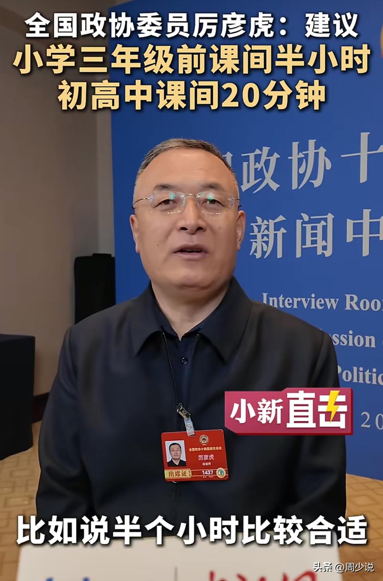 “这条教育建议火遍全网!”全国政协委员厉彦虎直指校园痛点:小学低年级孩子长期久坐、少出门,脊柱侧弯、近视、焦虑悄悄找上门,他提议把课间从10-15分钟拉长到30分钟,强制孩子走出教室,老师不许拖堂占时间。 此话一出,不少家长看完直呼说到心坎里。有网友感慨:“我家娃一年级,课间10分钟刚跑下楼就打铃,一天坐六七个小时,驼背越来越明显。” 也有老师坦言:“短课间刚收拾完教具,孩子还没舒展就上课,确实不利于放松”。 在周少看来,延长课间不只是多给孩子玩的时间,更是把健康还给童年。很多学校怕出事、怕耽误进度,把孩子“圈”在教室里,看似抓学习,实则透支健康。本身学习和成长从来不是对立的,充足的活动能让孩子上课更专注,状态更积极。 落实这项建议,需要学校、家庭一起发力。学校不妨严格执行禁拖堂,把课间真正还给孩子;家长也多鼓励孩子出门动一动,别总盯着作业。 教育的本质,是先守护好孩子的身心健康,再谈知识收获,这才是最该坚持的教育初心。 对于建议3年级前课间半小时初高中20分钟,大家认同不?#寻美三湘# #周少说教育# #寻美湖南#