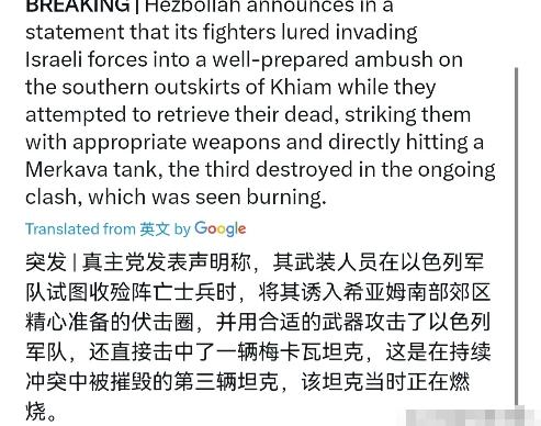 以色列军队中了埋伏,损失惨重!3月10日,黎巴嫩真主党发表声明称,以色列军队在希亚姆南部郊区进行侵略,而真主党利用打死了的以色列军人设下圈套,当以色列军人试图收回他们的死去的同伴时,真主党成员突然对这些军人发动进攻,武器袭击他们,并直接击中了一辆梅卡瓦坦克。 这次伏击看着是突发战况,其实是真主党摸透了双方博弈逻辑的精准算计。真主党没选正面硬刚,而是抓住以军“绝不遗弃战友遗体”的战场惯例,把阵亡士兵变成诱饵,这种战术看似简单,却戳中了以军的行动软肋。 以军的反应完全在真主党预料之中。 回收战友遗体不仅是军事传统,更关系到军队士气和国内民意,以军不可能坐视不理。 真主党正是利用这种必然反应,提前在回收路线上部署火力,等以军进入预设区域再突然发难,打了个时间差和地形差。 希亚姆南郊的地形本就复杂,适合隐蔽伏击,真主党长期在这一区域活动,对街巷、植被分布了如指掌,进一步放大了伏击效果。 被击中的梅卡瓦坦克,一直是以色列陆军的王牌装备,以防护能力强著称,但这次折戟并非偶然。 这款坦克的设计侧重正面装甲防护,应对传统战场的正面攻击确实有优势,但在伏击场景下短板明显。 真主党使用的反坦克武器针对性极强,大概率是俄制科耐特-E导弹或伊朗提供的改进型陶氏导弹,这类武器能穿透复合装甲,而且真主党选择的攻击角度很刁钻,避开了正面主装甲,可能瞄准了发动机舱或炮塔侧面的薄弱部位。 更关键的是,梅卡瓦坦克的对空和近距离警戒能力不足,在复杂地形下难以发现隐蔽的发射点,等导弹袭来时已经来不及反应。 真主党能完成这样的伏击,背后是成熟的作战体系支撑。 作为黎巴嫩最有实力的武装组织,它不仅有伊朗长期提供的武器援助,还有一套高效的情报和动员机制。 事前肯定通过潜伏人员或无人机摸清了以军的巡逻路线和活动规律,才敢精准设伏。 而且真主党在黎巴嫩南部有深厚的社会基础,当地什叶派社区的支持让他们能隐蔽部署、快速集结,打完就撤,不给以军反击的机会。 这种“民间基础+外部支持+灵活战术”的组合,让真主党在和以军的对抗中一直占据主动。 以军的应对暴露了明显短板。 虽然以色列拥有先进的情报系统和边境防御设施,但在应对这种非对称伏击时,高科技装备的优势很难发挥。 以军的边境监控更侧重防范大规模渗透,对小规模武装的隐蔽部署和战术动作侦测不足,没能提前发现真主党的伏击准备。 此外,以军在边境地区的行动模式相对固定,容易被对手摸透规律,这次回收行动的路线和兵力配置缺乏变通,给了真主党可乘之机。 这场冲突不是孤立事件,而是黎以边境长期对峙的缩影。 自2023年巴以冲突升级后,黎以边境的摩擦就没断过,真主党一直通过零星袭击牵制以军兵力,减轻巴勒斯坦方面的压力。 这次伏击更是精准把握了“打而不炸”的尺度,既展示了军事存在,又没引发全面战争,符合真主党的战略诉求。 对真主党来说,这种低成本、高收益的伏击战,既能打击以军士气,又能巩固自身在黎巴嫩国内的政治地位,还能向伊朗证明自己的“代理人价值”,一举多得。 以军后续大概率会采取报复行动,比如空袭真主党的据点或武器仓库,但很难彻底根除这种伏击威胁。 黎以边境线漫长,地形复杂,真主党的武装人员分散部署,以军的高科技武器难以覆盖所有隐蔽点。 而且真主党已经形成了“你来我往”的对抗节奏,以军的报复只会引发新一轮反击,形成循环对抗。 更重要的是,真主党的存在根基是以色列的持续施压,只要以黎领土争端和巴以冲突得不到解决,这种低强度冲突就会一直持续。 这场伏击的本质,是非对称战争的典型体现。 真主党没有以军那样的重装部队和高科技装备,却通过精准拿捏对手的弱点和战场规则,实现了以弱胜强。 而以军虽然装备精良,却在复杂的地缘博弈和非对称对抗中难以施展,陷入了“装备先进但赢不了小规模冲突”的困境。 这种对抗模式,也折射出中东地区冲突的深层逻辑:军事力量的强弱不再是唯一决定因素,对战场规则的理解、对民心的争取、对战术的灵活运用,同样起着关键作用。 未来黎以边境的局势,大概率还会在这种“伏击-报复-再伏击”的循环中延续,双方都在试探对方的底线,却没人能轻易打破僵局。
