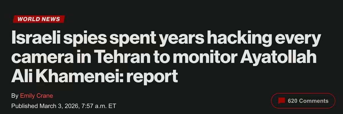哈梅内伊行踪被全程直播,美以看得一清二楚,连进了办公室都知道 哈梅内伊被斩首的细节进一步曝光,让人细思极恐。据《纽约邮报》报道,伊朗首都德黑兰的城市监控系统,几乎完全被以色列控制,包括一个直接对准哈梅内伊官邸的摄像头。它们实质上变成了摩萨德和以色列国防军8200部队,而且已经持续了数年之久。 网友,为什么M国和西方国家及日本韩国路上很少有摄像头有也是有关交通方面的,我们该醒醒了。大数据时代,你的一举一动都被人盯着!人点击一种商品,无数个平台立了轰炸你!你点击一种服务,立马有很多人联系你! 通过这种长期的系统接管,以色列相当于打游戏开了全图,不说掌握哈梅内伊的一举一动,起码哈梅内伊在德黑兰活动时,就如同直播一样,以色列可以轻松且准确地掌握。一名以色列情报官员声称:我们对德黑兰的了解程度就像对耶路撒冷一样。当你对一个地方的熟悉程度就像对自己长大的那条街一样时,任何细微的异常都逃不过你的眼睛。 一直都说是内鬼,结果是监控。这就有点意思了,大街小巷的监控给敌人提供了可靠的数据。 伊朗似乎觉得只要把核心人物藏得足够深,依靠人力安保和书信传递就能对抗现代科技。只要核心圈子全都是精挑细选的死忠,就不可能出问题。但现实是,保镖再忠诚也要下班回家,也要开车通勤,手机也要和附近的信号塔交换数据。只要你是社会里运转的一个活人,就会不断产生数据残留。这些数据残留汇总之后,就成了情报富矿,以色列官员虽然恶毒,但对工作认真负责一丝不苟却是天下少有。绝非其它腐败官员心中只有金钱美酒与女人可比拟的。 而除了看监控,以色列还深度渗透了伊朗的移动通信骨干网。行动当天,情报人员紧盯伊朗高官的手机信号,看着他们准时向巴斯德街的办公区聚集。而为了彻底切断哈梅内伊团队的预警可能,在炸弹落下前几分钟,还定向瘫痪了官邸附近的约12个移动通讯基站。 伊朗外长都用的是苹果手机,这妥妥的给美以送情报。以色列总理用的是专用机,摄像头都要用胶纸盖着防泄密 网友,所以说,安装监控好不好,就是一个双刃剑。用来监督老百姓,因为老百姓都是守法公民。是有一定的好处,也起到了一定的震慑作用。但反过来,如果监视像哈梅内伊这样的领导人,你们的行踪也都在敌人的掌控之中,对你们来说就是十分危险的事情。是网络,手机,电脑,摄像头。这些用美国的产品被监控了。美国为什么欺负华为,就因为监控不了。