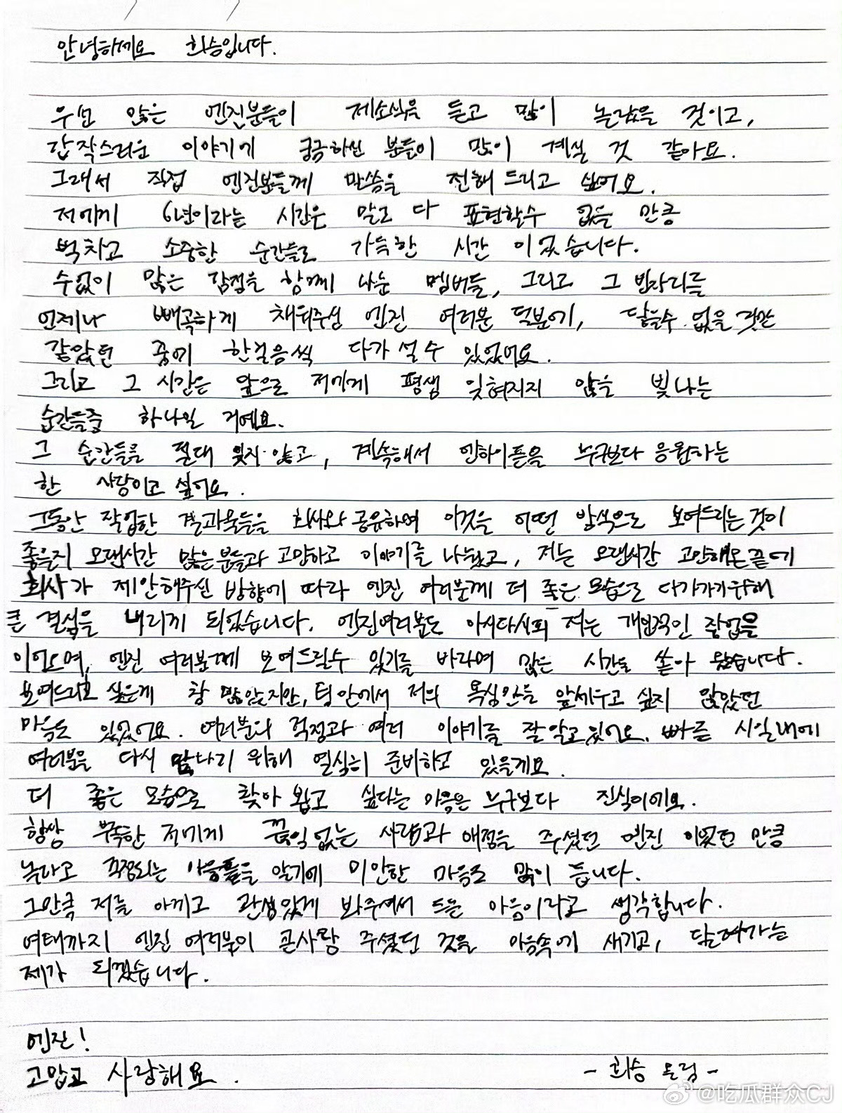 李羲承本人也发布手写信,表示是把个人创作分享给粉丝,也跟很多人做了长时间讨论,最终决定按照公司提议方向做出这个重大决定。