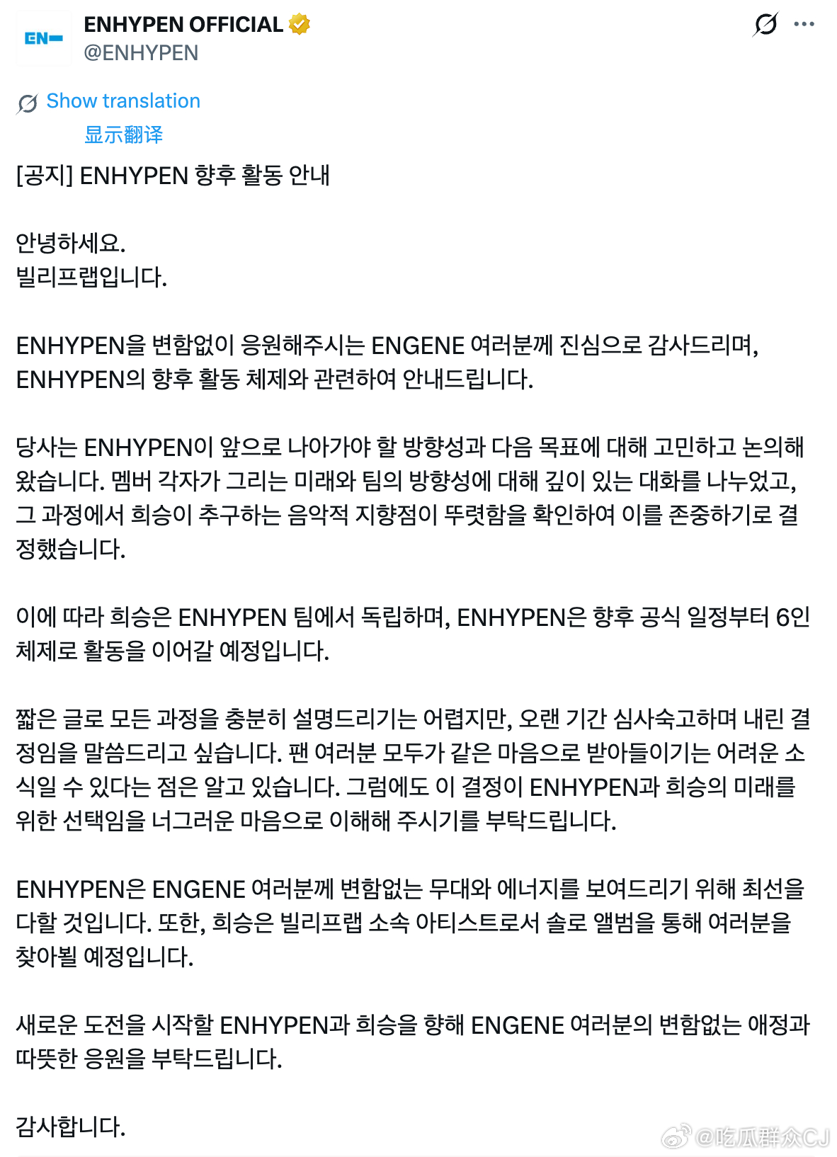 ENHYPEN组合发布通告,李羲承将solo发展,组合以六人形式延续。李羲承退队
