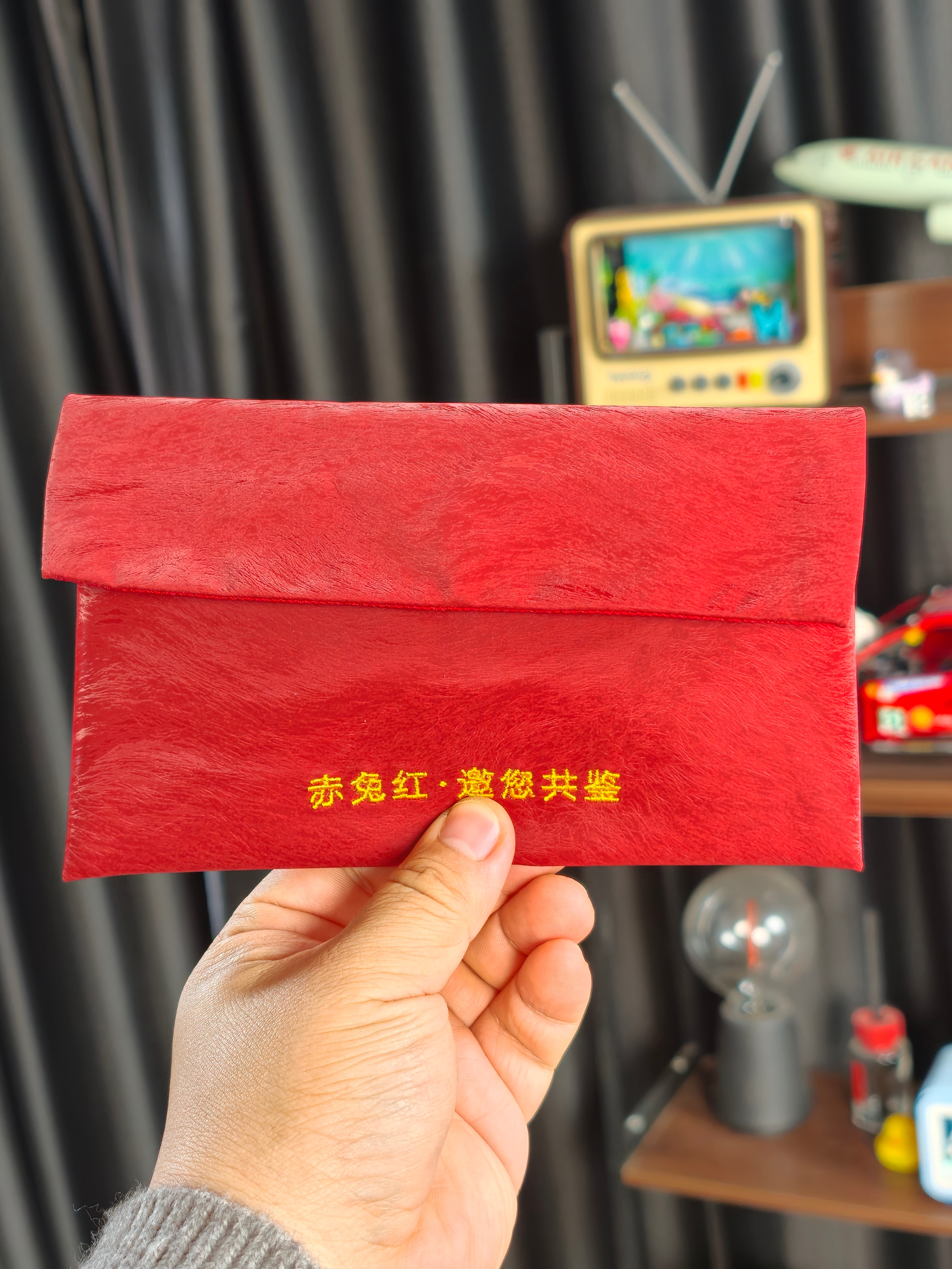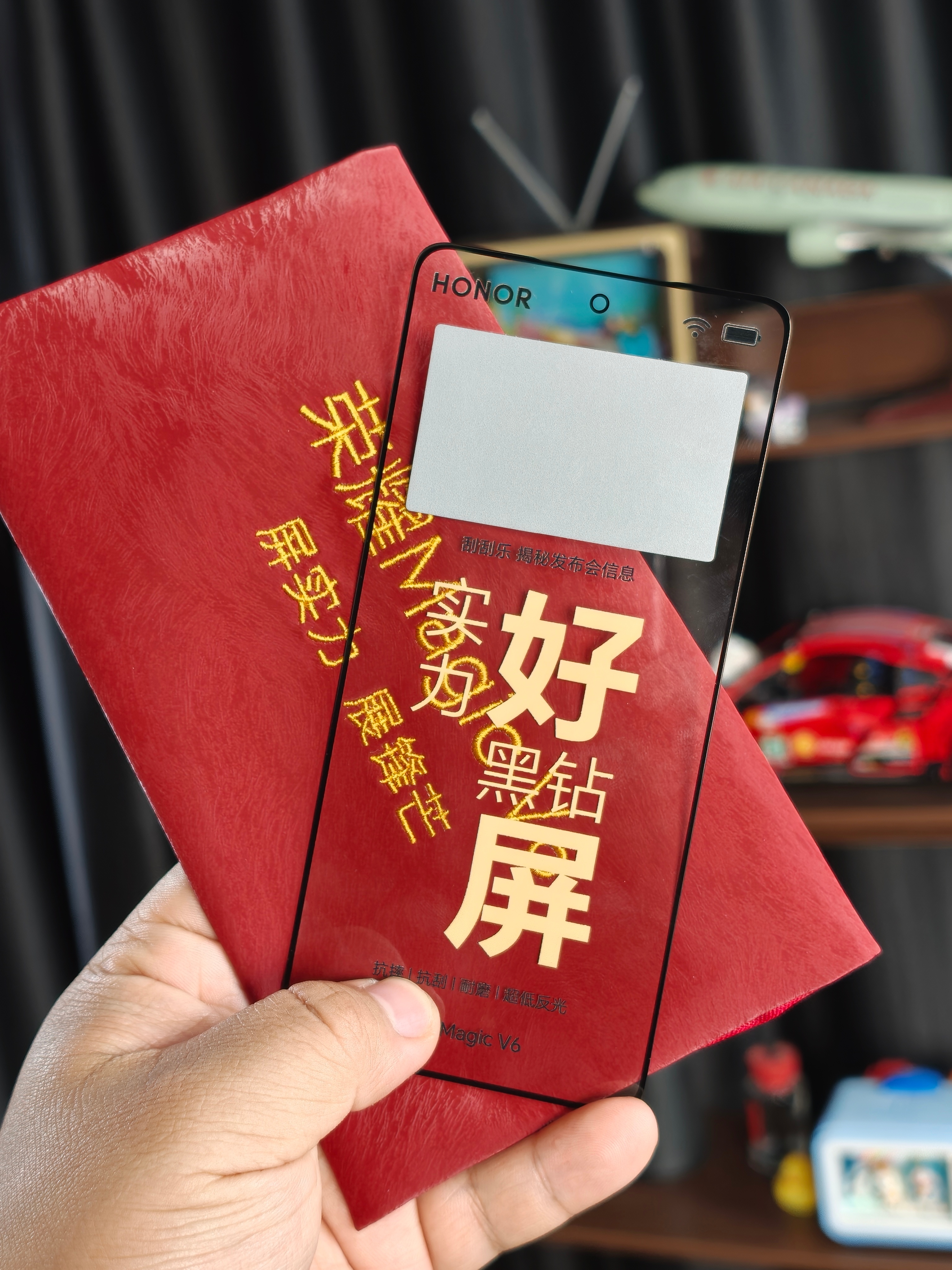 续上次的电池扑克牌,又来了一个荣耀Magic V6邀请函,赤兔红皮质红包质感拉满,拆开是一块至臻黑钻屏面板,还附赠砂纸。实测了一下,用砂纸反复狂刮,屏幕毫发无损,抗刮耐磨实力直接可视化。