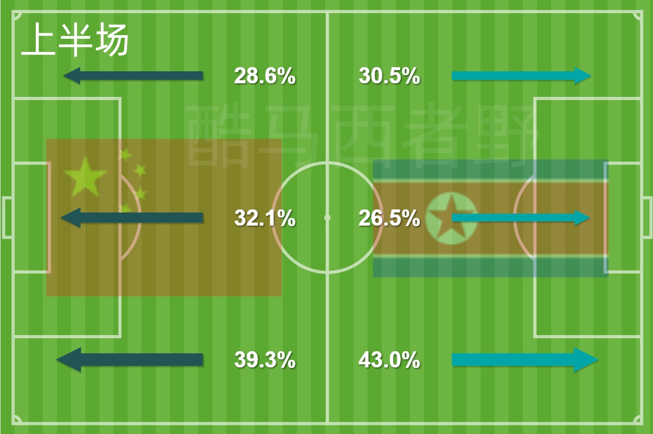 这是昨天我们和朝鲜女足上下半场在进攻三区的状态图,从图中可以看出来我们中国女足进攻的重心始终是在右路的,也就是乌日古木拉和张程雪这一边,所以赛后有些球迷说乌日古木拉踢得不好,这是不公正的,昨天我们中国女足之所以能够战胜对手,最重要的原因就是所有的球员都完成了自己赛前部署的任务和职责,乌日古木拉对于朝鲜女足这边进攻和防守的压制作用很大