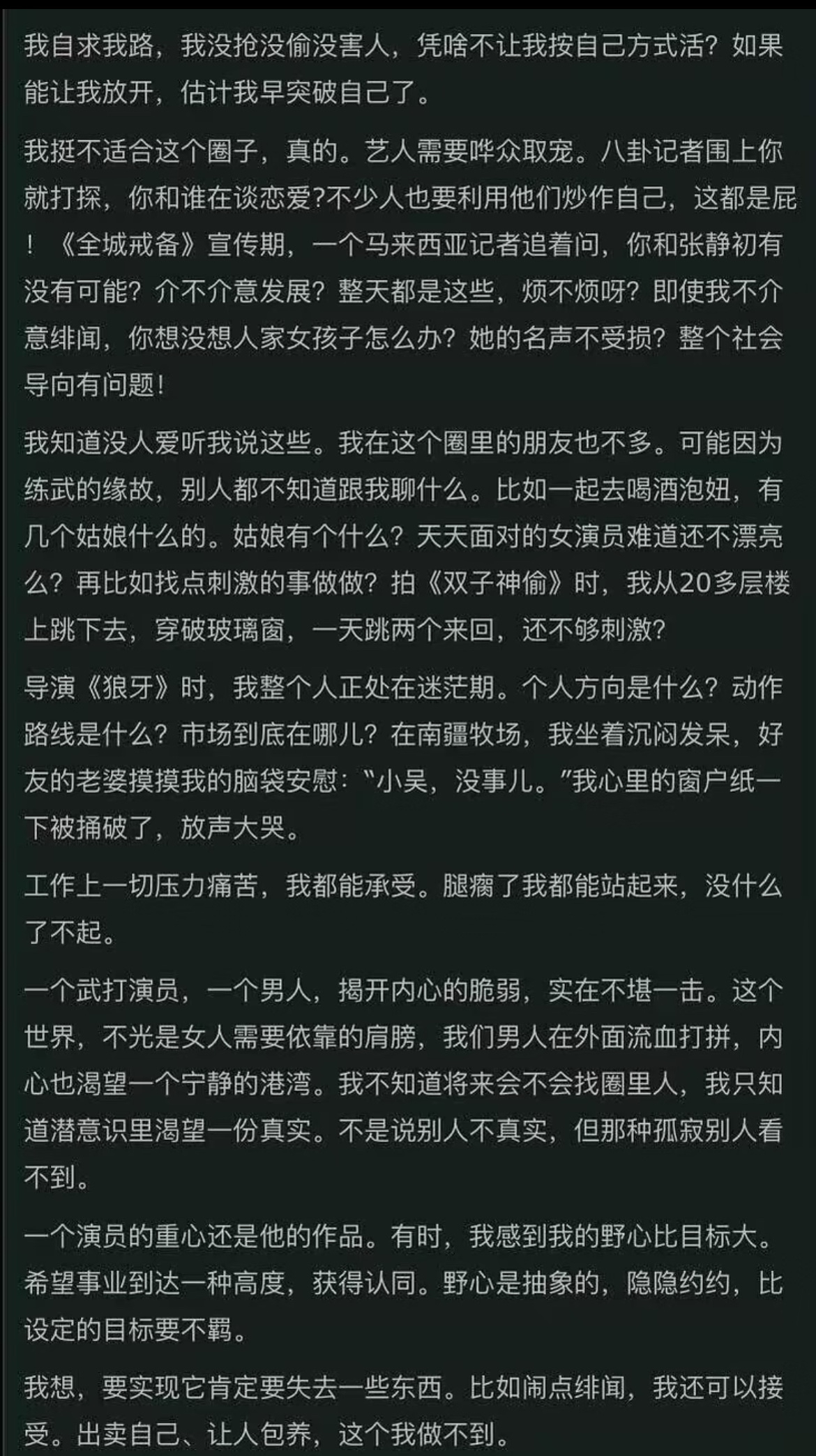 吴京花了6~7个亿投拍的《镖人》票房已经位列全球武侠片影史亚军了,仅次于得了奥斯卡奖的《卧虎藏龙》。谁还记得这个50岁的糙汉子,年轻的时候也是嫩得能掐出水的奶油小生啊?网友扒出年轻时的吴京写的博客,他说受不了娱乐圈的八卦,但为了拍戏也能忍,闹点绯闻能行,但出卖自己,被包养,他做不到。原来年轻的时候吴京还有被包养的苦恼呢。