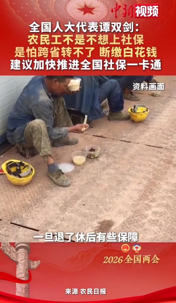 2026年全国两会期间,人大代表谭双剑说的一番话,戳中了全国近3亿农民工的心声。 他直白地说,农民工不是不愿意交社保,而是真的怕——社保跨省转不了,一旦断缴,之前交的钱就全白费了,这就是大家不敢参保的最实在的顾虑。 所以他建议,赶紧推进全国社保一卡通,把跨省交社保的流程弄简单点,让社保能跟着人走,彻底让大家放心。 谭双剑本身就是农民工出身,早年在工地上做水电工,一步步从底层务工者变成技术骨干,还拿过全国劳动模范。 他天天和农民工打交道,知道大家在外打工有多难,更清楚社保问题让大家有多犯愁。他的建议不是瞎提的,都是常年在一线看、实地调研来的,每一句都说到了农民工的心坎上。 咱们全国差不多3亿农民工,大多在建筑、制造、物流、家政这些行业干活,这些行业最明显的特点就是人流动性大。 农民工跟着活计走,今年在这个省打工,明年可能就去另一个城市,跨省奔波是常事。 可现在的社保是按地方管的,得跟固定工作单位、固定地点绑在一起,这就和农民工的工作方式拧巴上了。 很多农民工都有过这样的经历:在一个城市交了几年社保,换地方打工后,想把社保转过去,流程特别麻烦。 得来回跑两地,准备各种材料、办各种手续,不少农民工文化不高,看不懂复杂的政策,也没多余的时间和精力折腾。 更怕的是,转移的时候一旦断缴,之前交的年限就不算数了,凑不够最低要求,老了就领不到养老金,辛辛苦苦交的钱就白扔了,这才让大家不敢轻易参保。 除了转社保麻烦,有些企业也不地道,加重了农民工的社保难题。按规矩,只要雇了农民工,就必须给交五险,但有些建筑公司、小厂子为了省钱,故意不给交,还找借口说“你是临时工,不用交”。 还有的企业让农民工签“自愿放弃社保”的协议,其实这协议本身就是违法的,不算数,却让不少农民工没了应有的保障。 农民工干的是城市里最辛苦的活,高楼大厦、马路桥梁,哪一样都离不开他们的汗水。可要是没社保,万一受伤、生病、老了干不动了,整个家都可能垮掉。 尤其是50岁以上的农民工,体力越来越差,找工作越来越难,对养老、看病的保障需求更迫切,社保就是他们晚年最靠谱的依靠。 谭双剑代表提的加快全国社保一卡通,就是解决这个难题的关键。说白了,这就像身份证一样,全国通用,人走到哪,社保就跟到哪,换城市打工不用再特意办转移,也不会断缴,缴费年限能连续算,彻底打消大家“白花钱”的顾虑。 而且现在技术也成熟,全国社保基本都联网了,京津冀、长三角早就实现跨省通办,这些经验推广到全国就行。 除此之外,谭双剑还建议,强制企业给农民工交五险,不让企业钻空子,同时给灵活就业的农民工找合适的保障方式。 社保是老百姓的保障根基,农民工为城市发展出了那么多力,理应享受到公平的社保。 希望这个建议能尽快落实,让每一位农民工都能放心参保、安心打工,老了能有依靠,拥有稳稳的幸福。