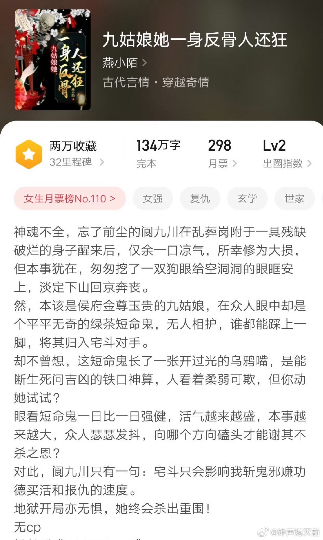 太好笑了,大女主文直接性转爆改大男主剧,原书还叫《九姑娘她一身反骨人还狂》,以后