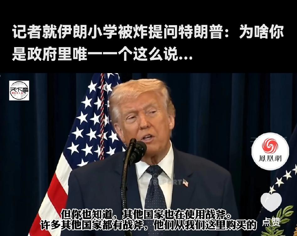 甩锅天花板!特朗普被问伊朗小学被炸 战斧导弹不是只有我们有 当地时间3月9日,美国佛罗里达州迈阿密记者会,记者当场灵魂拷问特朗普:2月28日伊朗米纳卜小学遭战斧导弹袭击,165名女童遇难,美国政府内只有你一人咬定是伊朗自导自演,连国防部长都不站台,你到底为啥这么认为? 特朗普当场整活:“别的国家也有战斧啊,好多都是从我们这买的,伊朗也有!” 这可不是他第一次甩锅。此前被问到小学被炸时,他直接说:“是伊朗干的,伊朗的导弹非常不精确。” 一边把美军战斧袭击,说成伊朗自己误炸;一边睁眼说瞎话,谎称伊朗也有战斧导弹。 真相一目了然:战斧导弹是美国严格管控的战略武器,全球只有英国、澳大利亚极少数盟友拥有。整个中东,以色列没有、沙特没有、阿联酋没有,伊朗更没有一枚战斧。而且在这次冲突里,美军是唯一使用、唯一发射战斧导弹的一方。 谁发射的,答案清清楚楚。如果别国真有战斧,这锅也早就甩出去了;可现实是,除了美军,没人能射出战斧。 自己是唯一发射战斧的,转头就甩锅“谁都有”;再看看那些政府同僚,集体沉默无言以对,最后他还忘不了补一句“我了解不够”。 面对儿童伤亡,不认错、不担责,锅甩得比导弹还快,这波操作,也就特朗普能玩得这么溜!