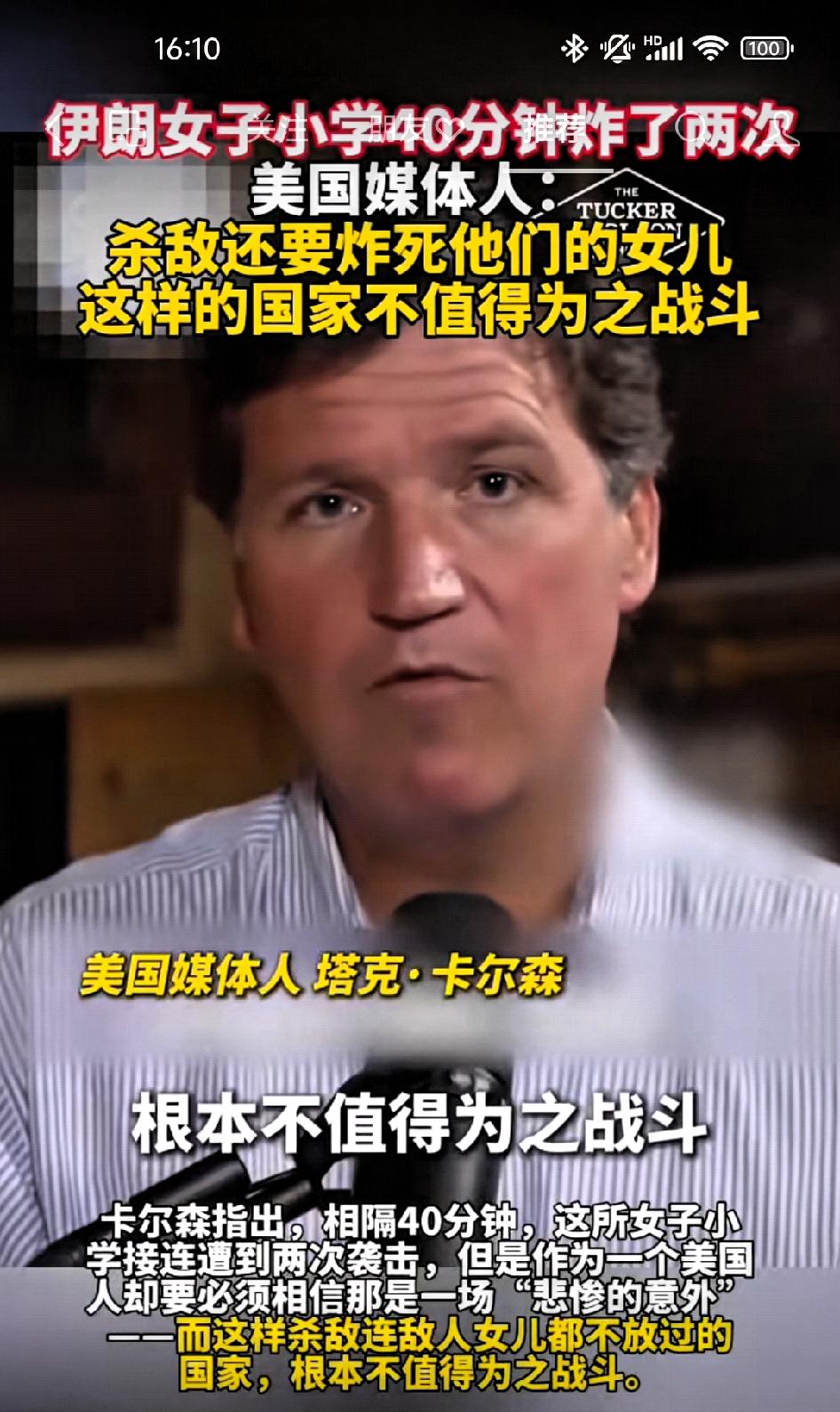 美国媒体人塔克.卡尔森:杀敌还要炸死他们的女儿,这样的国家不值得为他而战斗! 如果你早上醒来,发现自己生活在这样一个国家,认为不仅仅杀害军官本人,就连杀害他们的女儿也是可以接受的,那么这样的国家不值得为他而战斗。 卡尔森的话让所有人都变得无比沉重。战斧导弹、伊朗、学校、100多名女孩——这些关键词拼凑出的画面,足以让任何关于“正义战争”的叙事瞬间失语。 从技术层面看,战斧Block IV的CEP(圆概率误差)理论上在10米以内。这意味着,如果它击中的是一所学校,那不是“偏离目标”,而是目标被锁定为“学校里的某个点”。五角大楼事后大概率会用“情报错误”或“误判”来定义——但无论怎样定义,100多个女孩不会回来了。 这引出了更深层的悖论:当你的武器库里有世界上最精确的制导系统,却反复炸死平民,这已经不仅是军事问题,而是道德赤字的问题。根据《柳叶刀》的统计模型,伊拉克战争期间,美军的精确制导武器占比从91年的8%飙升至03年的68%,但平民死亡率却比91年高出数倍。精确的武器没有带来精准的道德,反而让战争发动者获得了“我们可以零伤亡征服他国”的幻觉。 卡尔森的狠话在于,他把爱国主义还原成了最朴素的画面:你可以说服自己是在打击敌人,但当导弹的残骸里散落着女孩的头巾时,那个理由还站得住吗? 这或许是他这番话能在美国引发广泛共鸣的原因——不是反战,而是对“用高精度武器制造高像素暴行”的本能反感。当一个国家习惯了用“附带损伤”来消解个体生命的重量时,卡尔森这句“不值得为之战斗”,就成了对爱国主义最刺痛的诘问。