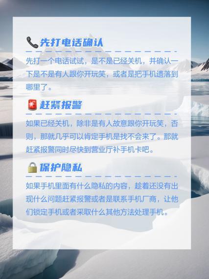 手机丢了千万别慌,按下面五个步骤做 第一步:先借个手机,不是报警 第二步:先挂失手机号 移动客服:10086 联通客服:10010 第三步:致电银行客服挂失银行卡 中国建设银行客服:95533 中国工商银行客服:95588 中国农业银行客服:95599 第四步:挂失支付宝账号打95188 第五步:冻结微信,微信客服95017,或登录腾讯卫士-账号安全、QQ/微信违规行为举报受理综合服务平台。 另外,不管手机是丢了还是被偷,要第一时间报警,警方介入能增加找回的概率。紧接着,赶紧联系运营商挂失SIM卡,别让坏人趁机用你的手机号干坏事,比如盗刷账户、诈骗亲友。 要是用的是苹果手机,那就掏出另一台苹果设备,打开“查找”APP。要是不小心遗失的,就远程锁定手机,附上联系方式和酬谢;要是确定被偷,就别留联系方式了,打开“找到通知”,它会给你发送手机最后出现的位置,给警方提供线索。 这儿可得提个醒,千万别信任何关于找回手机的短信或邮件链接,那全是钓鱼陷阱。苹果官方根本不会主动联系你帮你拦截手机,你要是输入了验证码,那手机可就彻底要不回来了。 要是你有怀疑对象,也能悄悄观察手机的移动轨迹,但一定得依法依规,必要时找警方或者快递帮忙,可别自己莽撞行事。