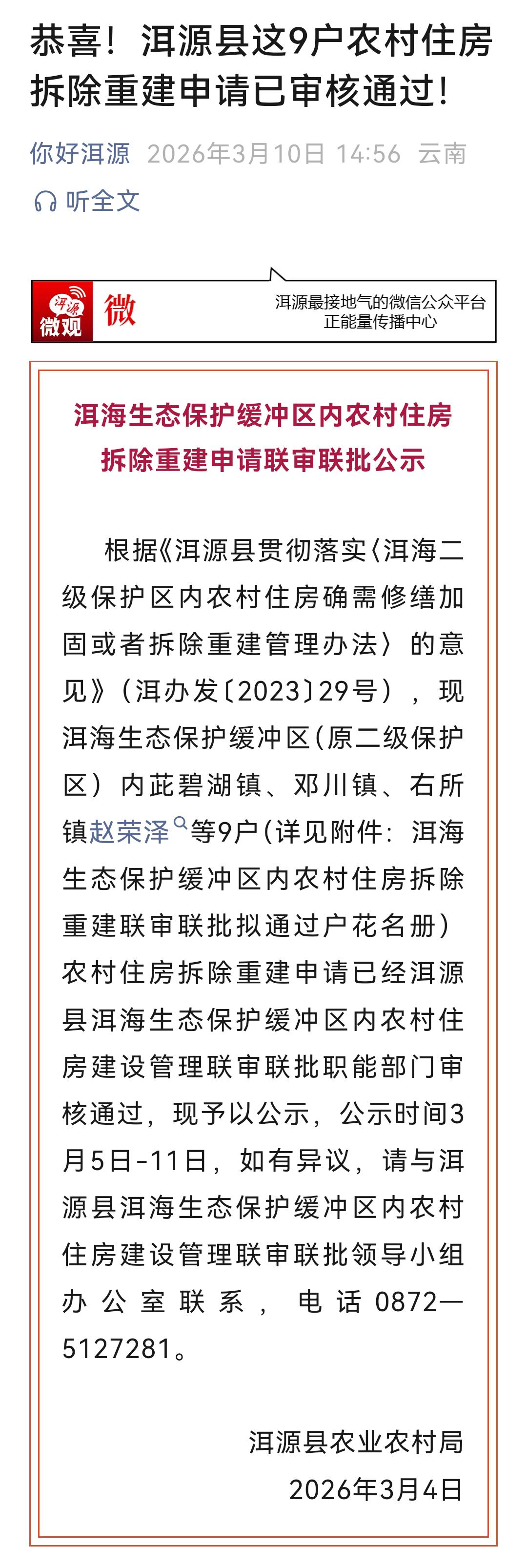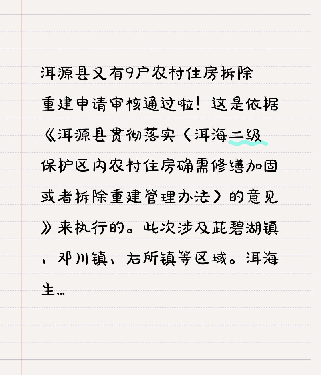 大理州洱源县又有9户农村住房拆除重建申请审核通过啦! 这是依据《洱源县贯彻落实〈洱海二级保护区内农村住房确需修缮加固或者拆除重建管理办法〉的意见》来执行的。此次涉及茈碧湖镇、邓川镇、右所镇等区域。 洱海生态保护至关重要,住房拆除重建审核严格也是为了更好地保护这片水域。此前洱海在生态保护方面做了不少努力,像打造自动化监测系统,建成水质监测“智慧化实验室”。这次9户申请通过,后续建设也肯定会遵循相关环保要求,期待洱海周边能在保护生态的同时,让居民住房条件也得到改善。 农村自建房
