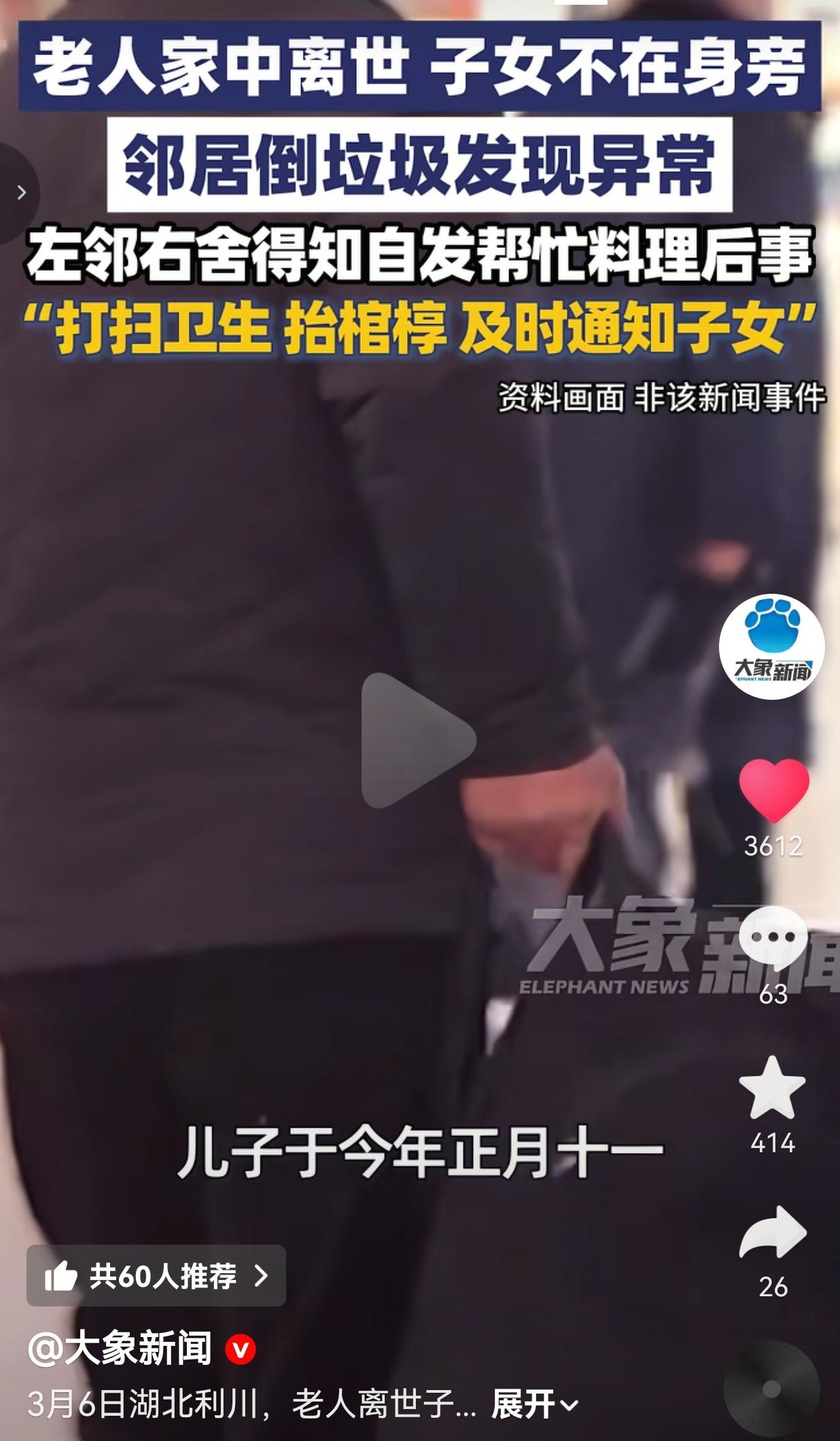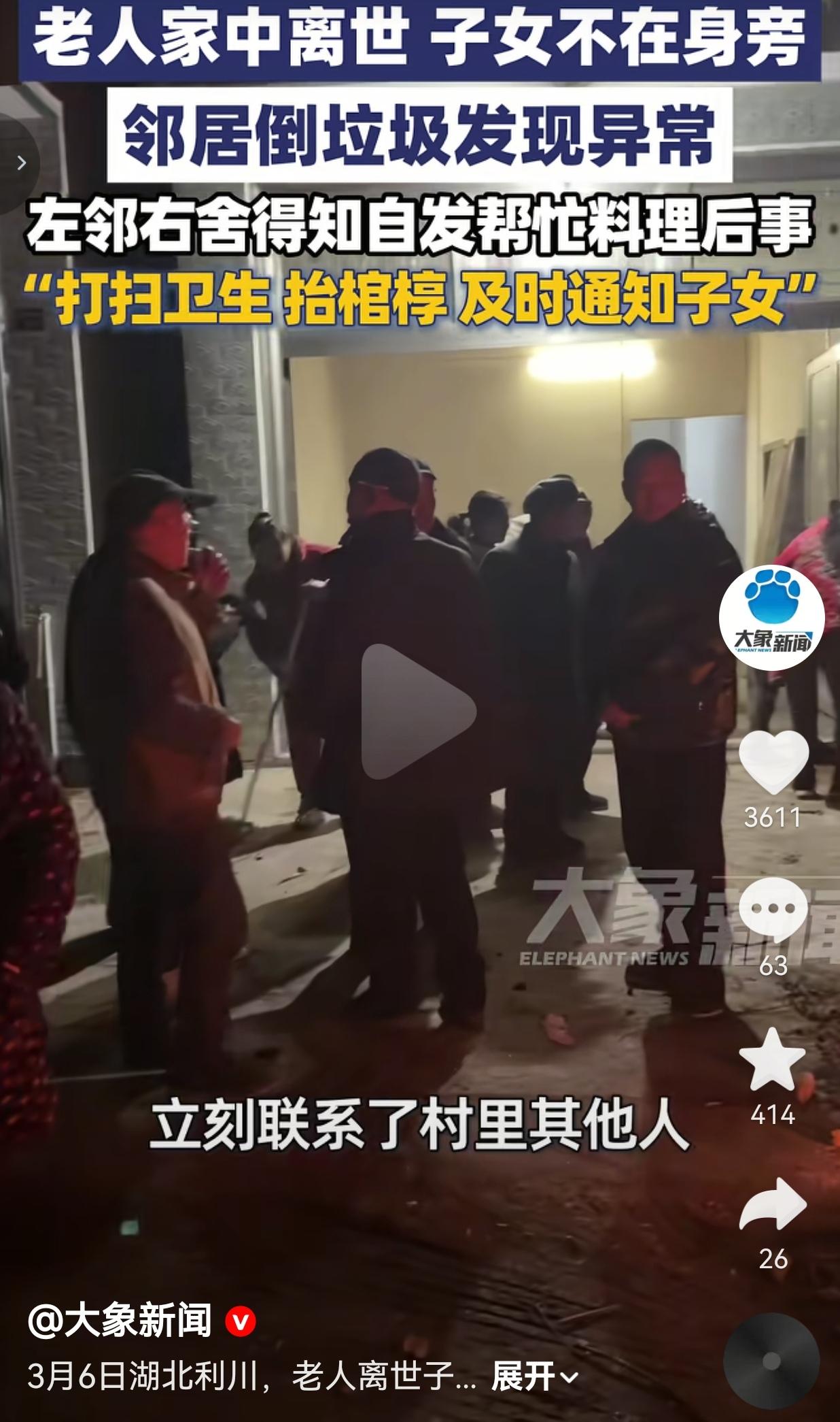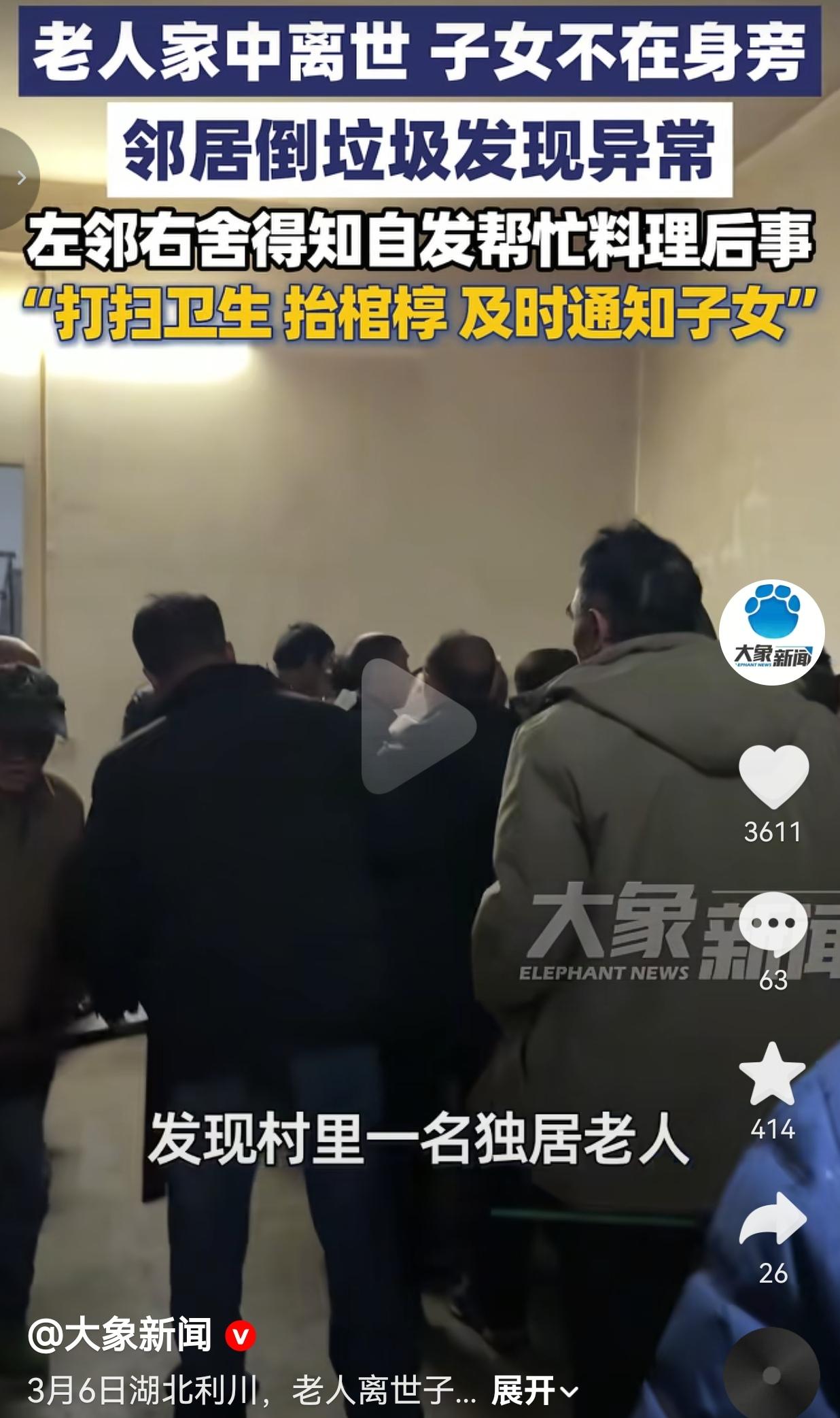 真的破防了!新年刚结束,儿子刚出门务工没多久,湖北78岁的独居老人在家离世,邻居知道老人去世的消息后,感动了无数网友。网友:远亲不如近邻真的具象化了! 近日,湖北利川,一位78岁的独居老人,就这么安安静静地,一个人在家走了。 老人一儿一女,女儿早就嫁人了,儿子过完年正月十一,就急急忙忙外出打工挣钱去了。偌大个房子,就剩下老人一个人守着,冷冷清清。 还是邻居好心,倒垃圾的时候发现不对劲:老人家里灯一直亮着,喊了好几声都没人答应,整整一天都没见出门,心里立马就慌了,赶紧叫村里人过来看看。 等邻居门打开以后,所有人都看傻眼了。因为,老人已经去世了。令人泪目的是,老人临终前,身边竟然连一个人都没有,连个送终的亲人都不在跟前。 虽然很凄凉,但是,故事很暖心。邻居一听说老人走了,左邻右舍全都跑来了,不用人喊,不用人安排,大家自动就忙活起来:有的帮忙收拾屋子,有的赶紧联系老人的子女,有的帮忙抬东西,连办丧事要用的鞭炮,都有人默默买好了。 村里的人都说:“都是乡里乡亲的,老人家走了,不能让他孤零零的。” 这边刚通知到老人的儿子,孩子当场就崩溃了,连夜开车往家赶,一路风尘仆仆,一刻都不敢停,直到第二天晚上才赶回家。 可再快的速度,也赶不上生死离别,推开门,再也没有等着他的老父亲了。 网友看到后评论说:“远亲不如近邻,这话一点不假!我们在外面挣再多钱,都不如有人在家多看老人一眼。感谢这些好心邻居,给了老人最后一点温暖。” 也有的网友说:“最怕子欲养而亲不待,我们总说等有钱了、等有空了,可老人等不起啊!” 还有的网友说:“邻居们太好哭了!虽然没有血缘,却做了亲人该做的事,人间自有真情在。” 要我说,现代人真的太难了!为了赚点钱,为了养家糊口,迫不得已选择背井离乡,把爸妈留在老家。我们总以为,打个电话、转点钱,就是孝顺了。 可老人要的真不是这些啊!他们要的是生病的时候,有人递一杯热水;是吃饭的时候,有人喊一声回家;是临走的时候,身边能有个亲人摸一摸、喊一声。 老人的孩子不是不孝,是真的太远了,远到连最后一面都见不上。 邻居虽然不是亲人,却在最关键的时候,给了老人最后的体面和温暖。 想想老人临终前一个人面对,真的觉得特别扎心! 我想如果那天邻居没多留意一眼,老人是不是要等到臭了才被发现?如果我们一直这样,为了挣钱把老人丢在家里,未来会不会有更多老人,就这么孤独地走完一辈子? 会不会有更多儿女,等到人没了,才拼了命往家赶,却只剩下一辈子的遗憾和后悔? 树欲静而风不止,子欲养而亲不待,这句话我们都会说,可真等到发生在自己身上,才知道有多疼。