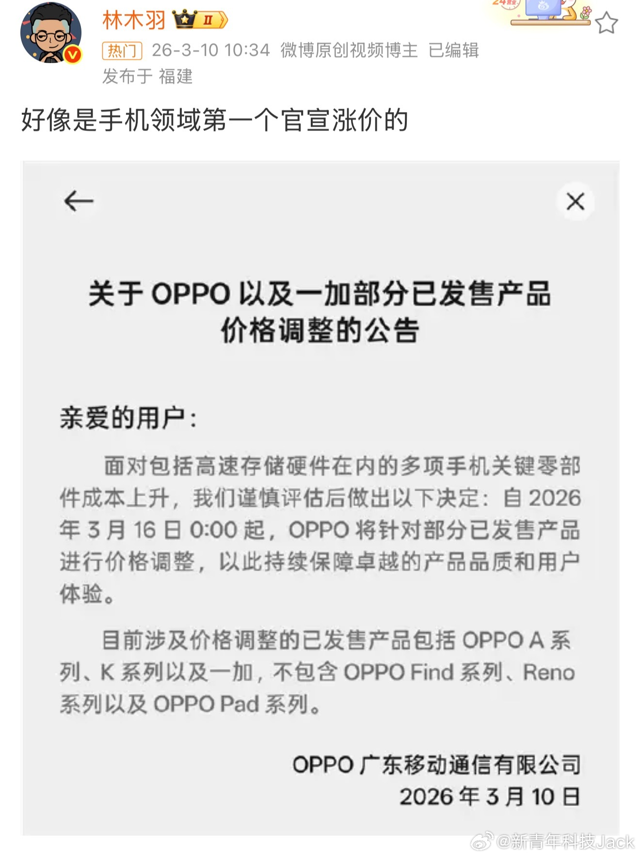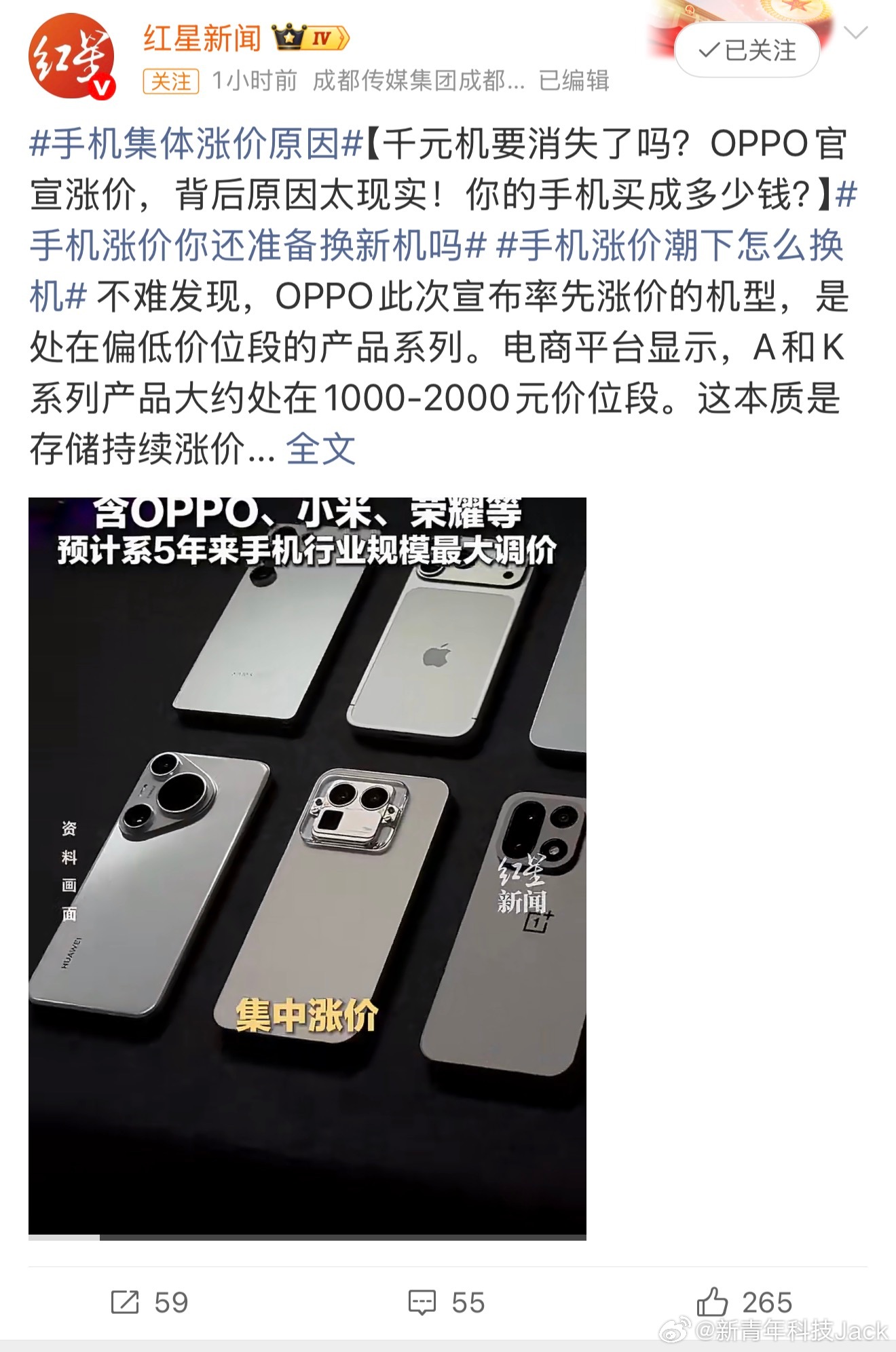 手机集体涨价原因 我觉得涨价无可厚非,内存涨价给厂商的定价压力太大了,各家都要开始调整定价体系,目前来看普遍涨价500会是一个现象。已经发布的产品调价,后面新发布的机型在增配的情况下,自然会提高产品的档位。子品牌们的核心竞争价位毫无疑问会上探到3-4K价位,2026年各家性价比很强的系列都会有不少的调整,赶紧看看哪家没涨价的先下手为强,这次是真的早买享优惠,晚买享涨价了!OPPO涨价