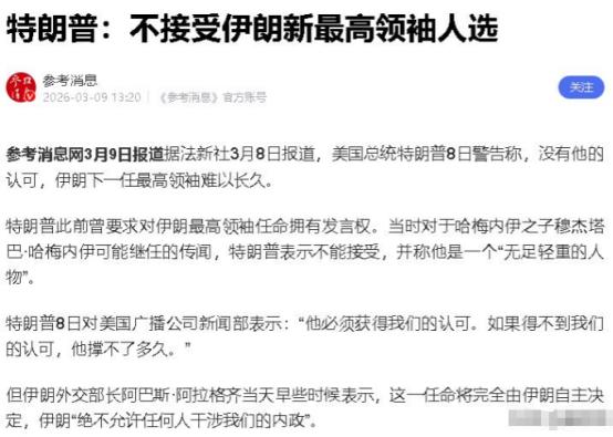 出大事了,美以首次反目,美使馆突遭意外,特朗普的威胁沦为笑话 先从最核心的消息说起,就在3月8号,伊朗传来一个重磅消息,直接引爆了整个国际舆论。伊朗的专家会议正式发表声明,推举已故最高领袖哈梅内伊的儿子穆杰塔巴·哈梅内伊,成为伊朗的新任最高领袖。 可能有人不知道,伊朗的最高领袖是这个国家最有权力的人,说了算,所以选谁当最高领袖,不仅关系到伊朗自己的走向,更会影响整个中东的局势。 本来美国和以色列是联手对付伊朗的,一起发动军事打击,可就在穆杰塔巴当选的前后,这对“铁哥们”居然闹掰了,这也是他们这次联手打击伊朗以来,首次出现重大反目。 事情的起因很简单,以色列在3月7号,突然对伊朗的30处燃料储存设施发动了突袭,这个规模远远超出了美国的预期,让美国特别不满。 有美国官员直接说,他们认为以色列这么做根本不是个好主意,甚至私下里跟以色列表达了“搞什么鬼”的不满。美国之所以生气,主要有两个原因:一是担心以色列袭击伊朗的民用基础设施,会让原本可能有分歧的伊朗民众,彻底团结起来支持新政府,反而不利于他们对付伊朗。 二是燃料储存设施被炸毁后,引发了大火,还导致国际油价暴涨,3月8号那天,国际油价突破了每桶100美元,这是2022年俄乌冲突以来第一次涨到这个价格。 要知道,美国最在意的就是石油价格,特朗普的顾问也明确表示,特朗普不喜欢这次袭击,他想保住石油,不想让石油被烧掉,因为油价一涨,美国国内的汽油价格也会跟着涨,老百姓会有意见,这对特朗普来说,可不是什么好事。 可以色列根本不管美国的不满,还放话说,这次袭击只是个警告,未来几天还会进一步升级,这就让美国和以色列的矛盾彻底摆到了台面上,首次公开反目。 就在美以闹矛盾的时候,美国的使馆突然遭遇了意外,可谓是雪上加霜。当地时间3月7号晚上,美国驻伊拉克的大使馆遭到了火箭弹袭击,使馆的防空系统虽然启动了拦截,但还是有一枚火箭弹击中了使馆的直升机停机坪,现场燃起了大火。 这是美以联手打击伊朗一周以来,第一次有导弹落到美国驻伊拉克使馆的区域,虽然没有造成人员伤亡,但也足够让美国慌神了。 更让人没想到的是,3月8号的时候,伊朗最高国家安全委员会秘书还发文说,有几名美国士兵被他们俘虏了,还指控美国为了掩盖真相,把这些士兵谎报成已经阵亡。 虽然美国军方很快回应说,这是伊朗的谎言,但不管这件事是真的还是假的,都给美国来了一记重击,不仅打击了美军的士气,也让美国在国际上丢了面子。 说到这里,就不得不提特朗普之前放的狠话,现在看来,那些威胁简直就是笑话。之前特朗普曾放话说,他拒绝接受任何延续哈梅内伊政策的伊朗新领导人,还说穆杰塔巴当选“不可接受”,甚至在3月9号的时候,还威胁伊朗,如果敢阻断霍尔木兹海峡的石油运输,美国就会对伊朗施以“比以往猛烈20倍的打击”。 可现实呢?穆杰塔巴顺利当选,伊朗国内各方都表态支持,还发动了新一轮的导弹打击,回应美以的袭击;美国自己的使馆遭袭,士兵被俘的消息传得沸沸扬扬;最关键的是,美国和以色列闹起了反目,以色列根本不听美国的指挥,特朗普想保住石油、控制油价的想法,也因为以色列的突袭彻底落空。 现在的局势就是,美国看似强大,却陷入了两难境地:一方面,想继续打压伊朗,可自己的使馆遭袭,盟友又不听指挥;另一方面,特朗普的威胁没有起到任何作用,反而让伊朗更加团结,态度也更加坚决。 而以色列只顾着自己的利益,不顾美国的感受,多年的盟友关系,在利益面前彻底出现了裂痕。 可能有人会问,接下来局势会怎么样?其实现在谁也说不准,但可以肯定的是,伊朗有了新的最高领袖,态度只会更加强硬,不会轻易向美以妥协。 美以之间的矛盾,短时间内也解决不了,所谓的“铁杆盟友”,已经名存实亡;而特朗普的那些威胁,只会越来越没有说服力,最后沦为国际社会的笑柄。 总结一下就是,3月8号伊朗选出了新的最高领袖穆杰塔巴,这个人对美以态度强硬,直接改变了中东的局势。原本联手的美以,因为以色列的突袭闹起了首次反目,美国不满却管不住以色列。 与此同时,美国驻伊拉克使馆遭火箭弹袭击,还被爆出俘虏美军的消息,麻烦不断;特朗普之前放的各种狠话,没有起到任何效果,反而成了笑话。这一系列的大事,让中东局势变得越来越复杂,后续有新消息,咱们再接着说。
