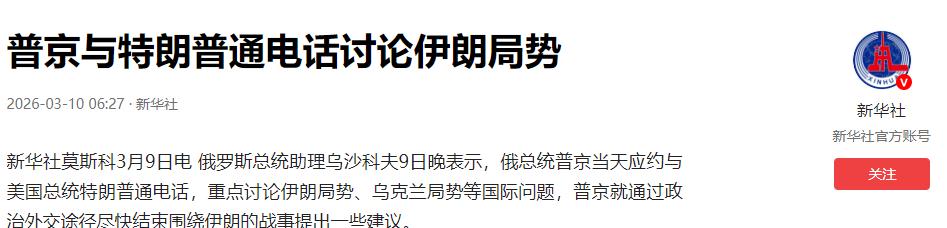普京应特朗普要求进行了约一个多小时的通话。刚刚,俄罗斯方面向外界透露,普京应特朗普的请求与其进行了长达一个多小时的通话,期间,双方不仅讨论了中东战争、俄乌战争,而且还讨论了委内瑞拉问题和国际能源市场稳定等。 根据俄罗斯总统助理乌沙科夫对外发布的消息,这通电话是特朗普主动提议的,整个通话过程务实、坦诚,也很有建设性,前后持续了大约一个小时。两人没有说空话、套话,全程围绕着当前国际上最棘手的几个问题展开讨论,主要就是中东战争、俄乌战争,还有委内瑞拉问题和国际能源市场稳定这几件事,每一件都牵扯甚广。 先说说两人聊的中东局势,这也是当前国际上最紧张的事之一。就在这通电话前不久,美国和以色列在2月28日联手对伊朗发起了大规模军事行动,这也是俄美两国总统在这件事发生后,第一次通电话。 通话中,普京明确提出,希望能通过政治和外交的方式,尽快结束伊朗周边的战事,还给出了具体的建议,比如让海湾地区多个国家的领导人、伊朗总统一起参与沟通,通过谈判解决问题,而不是一直靠打仗。 特朗普也向普京介绍了自己对当前中东局势的看法,两人就这个话题聊得很具体,也很有针对性,算是一次有意义的交流。 除了伊朗相关的战事,中东的巴以冲突也一直没停,这也是中东局势的重要一部分。根据最新的统计,自从2023年10月7日巴以新一轮大规模冲突爆发以来,以色列对加沙地带的袭击已经造成了7万多人死亡,十几万人受伤,就算是停火期间,也还有平民不断伤亡。 虽然两人通话时重点聊的是伊朗局势,但巴以冲突作为中东长期的热点问题,大概率也有所提及,毕竟要稳定中东局势,巴以问题也绕不开。 聊完中东的事,两人又说到了俄乌战争。俄乌这仗从2022年2月爆发,到现在已经整整四年了,目前战场上一直僵持不下,主要交战区域集中在顿巴斯和南部战线,俄军整体处于推进状态,乌军则在全力防御,双方都有不小的消耗。 通话中,特朗普再次表示,希望俄乌双方能尽快停火,找到长期解决问题的办法,而普京也表示,俄罗斯军队在特别军事行动中推进顺利,这也能促进乌克兰方面加快调解进程。 不过大家都清楚,俄乌冲突的分歧很大,尤其是领土问题,乌克兰不愿意做出让步,想要真正实现停火,还有很长的路要走。 紧接着,两人还讨论了委内瑞拉问题。最近一段时间,美国一直在针对委内瑞拉,不仅拦截委内瑞拉的油轮,还对其实施海上封锁,这种做法遭到了俄罗斯的强烈谴责。 俄罗斯一直支持委内瑞拉马杜罗政府,认为美国的行为违反了国际法,是在干涉他国内政。通话中,两人就委内瑞拉的局势交换了意见,普京也希望特朗普能拿出务实、理性的态度,在法律框架内解决和委内瑞拉的矛盾,不要继续加剧地区紧张局势。 最后,两人还聊到了国际能源市场的稳定问题。就在通话的前一天,也就是3月9日,国际油价出现了罕见的大幅波动,一天之内振幅超过40%,先是暴涨31%,逼近120美元/桶的四年高位,后来又因为特朗普暗示美伊战事可能很快结束,油价又暴跌11%,波动非常剧烈。 油价的涨跌不仅影响俄罗斯和美国的经济,也会影响全球各国的民生,比如汽油价格上涨,老百姓加油就会更贵,还会带动食品、化工产品等价格上涨。所以两人在通话中,从全球原油市场的角度,讨论了如何稳定油价,避免出现大幅波动,这对两国和全球经济都很重要。 这次通话,表面上看是俄美两国总统就国际热点问题交换意见,实则也是两国在当前复杂国际局势下,寻求沟通、避免误判的重要举措。毕竟俄罗斯和美国都是核大国,两国保持沟通,对全球和平与稳定都有好处。 通话结束后,俄罗斯方面也表示,双方都表达了保持经常性沟通的意愿,后续可能还会就相关问题继续交流。 其实大家也能看出来,这次通话聊的每一件事,都和全球局势息息相关。中东战事、俄乌冲突、委内瑞拉问题,每一件都牵扯到多个国家的利益,而国际能源市场的稳定,更是直接影响到普通老百姓的生活。 俄美两国作为世界大国,他们的沟通和表态,不仅会影响这些问题的走向,也会改变全球的格局。后续这些问题能不能得到缓解,还要看两国后续的行动,以及相关国家的配合。 这通一个多小时的通话,没有多余的客套,全是实打实的国际大事。普京和特朗普各自表达了自己的立场和诉求,也进行了务实的交流,这对缓解当前紧张的国际局势,或许能起到一定的推动作用。 毕竟在复杂的国际环境下,坐下来沟通,总比对抗要好,这不仅符合俄美两国的利益,也符合全球各国人民的共同期待。