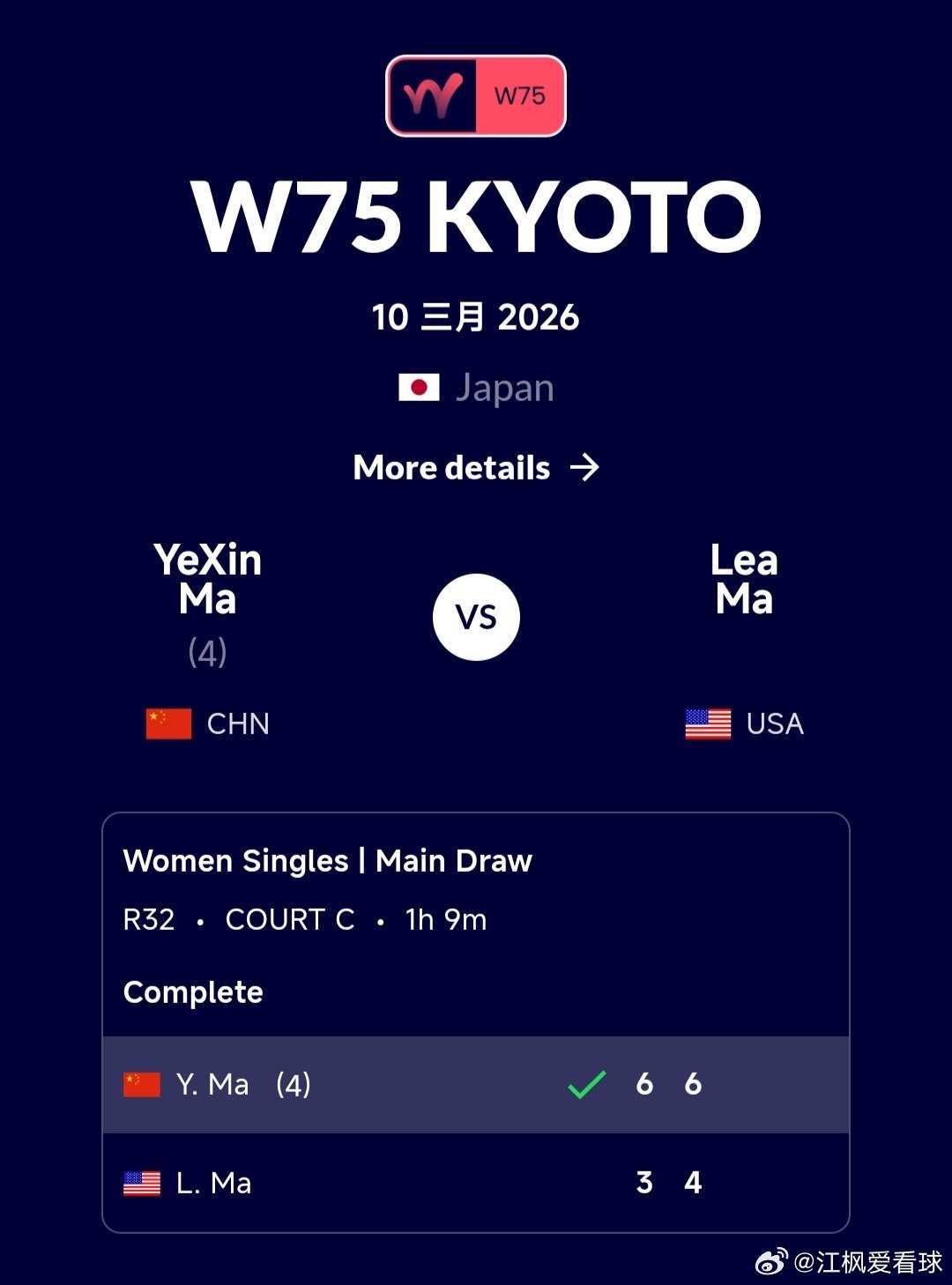 马烨欣🇨🇳6-3/6-4战胜莉亚-马🇺🇸,顺利晋级。恭喜马烨欣!🎉🎉🎉