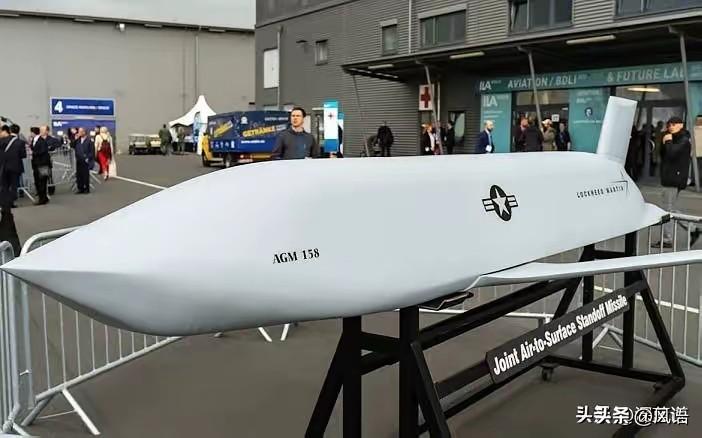 他们说这是AGM-158的残骸,个人看有点不像。 这枚导弹的战斗部还在,但传感器似乎自毁了,发动机似乎已被拆走,从现场看,这不是拦截第一现场,而是搬移后碎片拼凑现场。 AGM-158长4.2米,直轻0.5米,两片折叠翼,现场应是一毛马路,无实体参照物,但从一块20cmX10Cm的石块来看,该导弹应比AGM-158大,但要短。