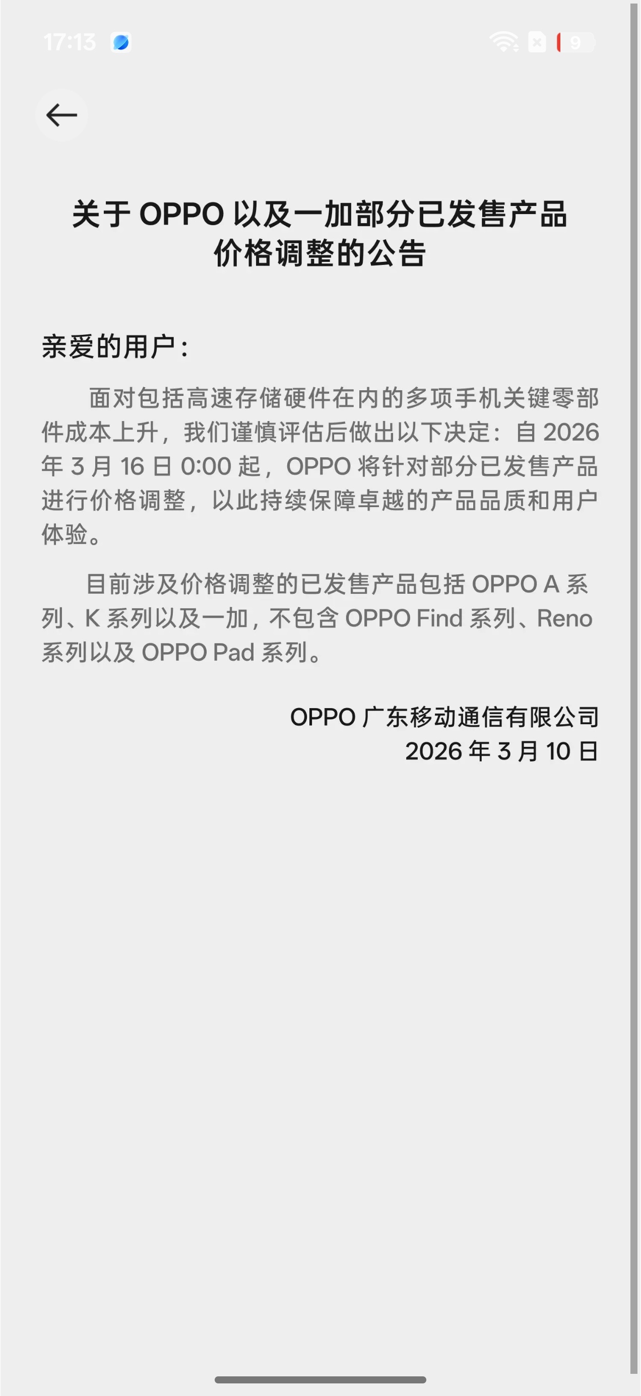我去官方商城看了一下,还看到了公告,这次受内存影响,高速存储硬件等手机关键零部件成本上升,部分在售产品也会调整价格,涨价原因可以理解,这波确实,内存涨,手机肯定也会跟着涨价,对很多性能机的影响很大,要买手机的得赶紧看看,不是厂商要涨价,真的成本问题,早买不仅早享受了,属于是价格也有优势了,行业普遍涨价也是早晚了。手机集体涨价原因OPPO涨价