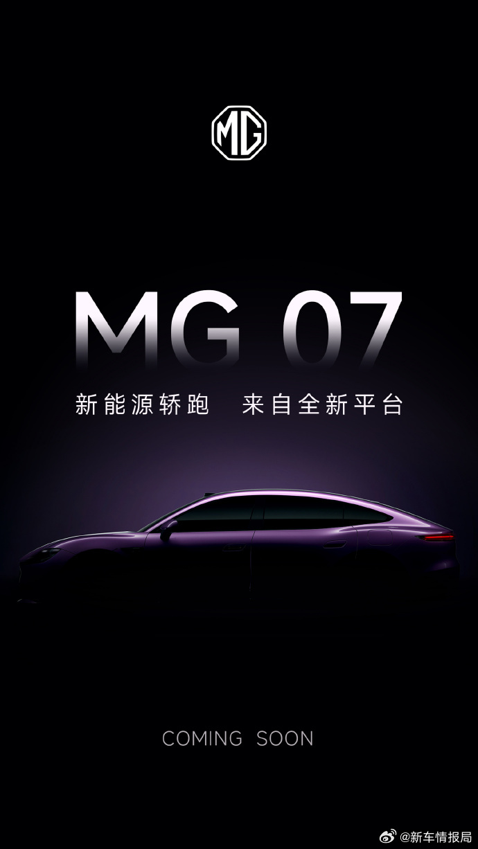 上汽MG预告新能源轿跑MG07 上汽MG官方最新发布:新能源轿跑MG 07,全新平台,期待见面。新车情报局
