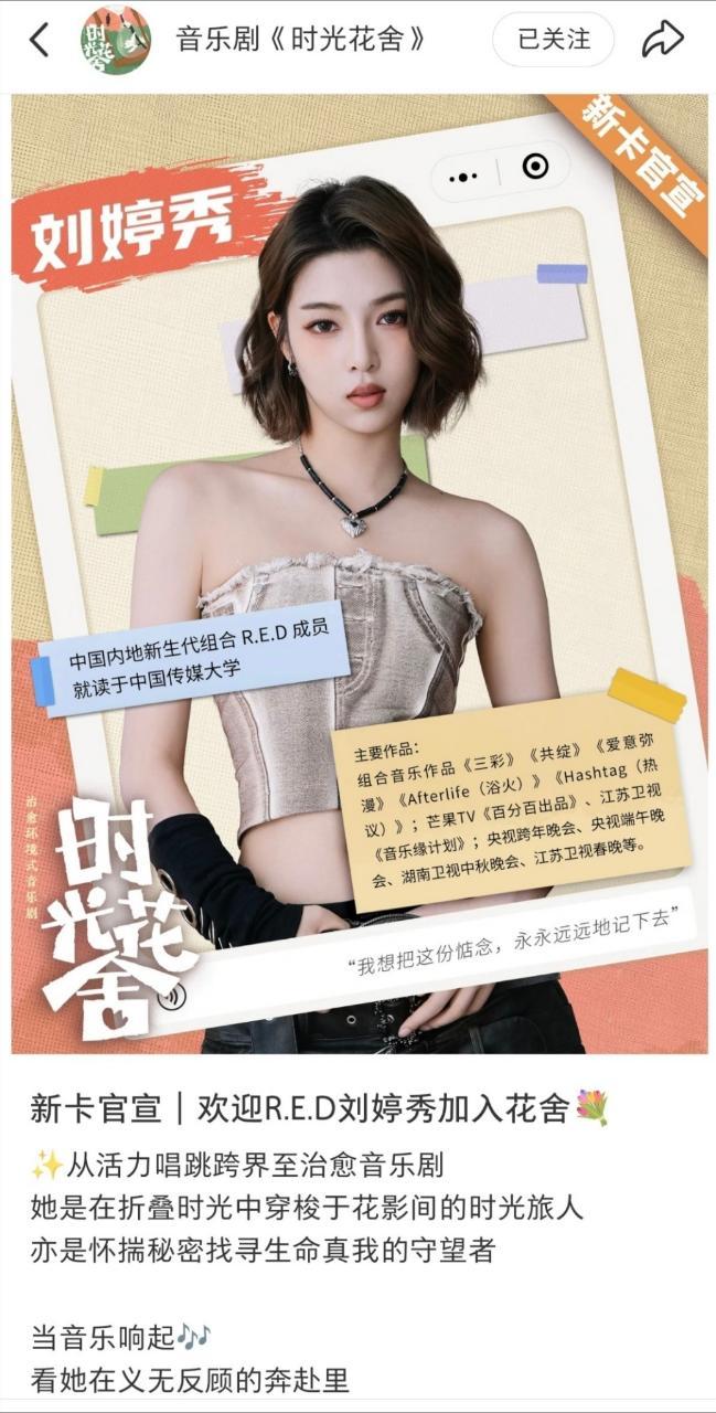 R.E.D刘婷秀跨界音乐剧谁的DNA动了!R.E.D刘婷秀要演音乐剧了首次参演《时光花舍》,从活力唱跳到治愈舞台,这个五月份跨界太期待!