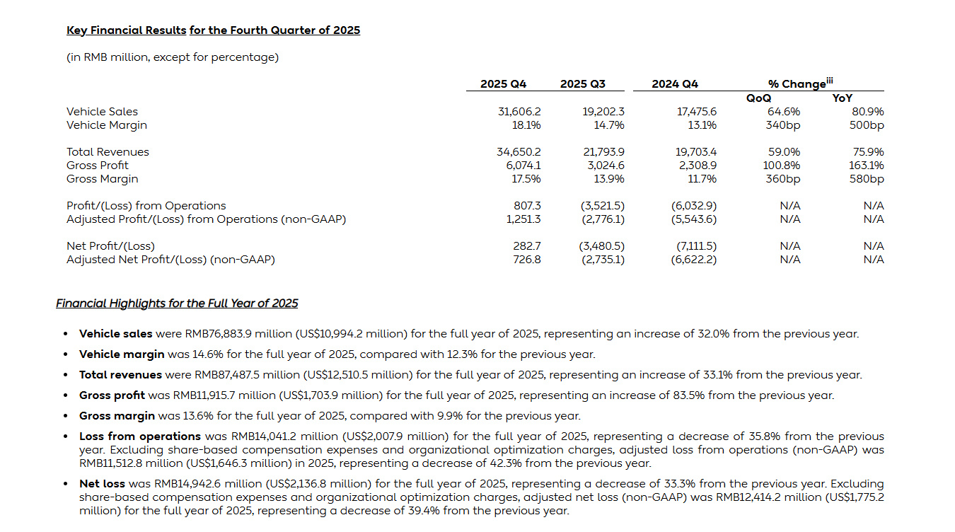 交付表现:四季度交付约12.48万辆(接近此前指引上限12.5万辆),创季度新高,全年交付量约32.6万辆,同比增长近47%。现金储备:四季度末现金储备达459亿元,环比大幅增长近百亿元,显示流动性显著改善。盈利原因:主要得益于销量持续增长、有利的产品组合(高端车型占比提升,推动整车毛利率优化)、全面降本增效措施,以及三品牌(蔚来、乐道、萤火虫)协同效应显现。