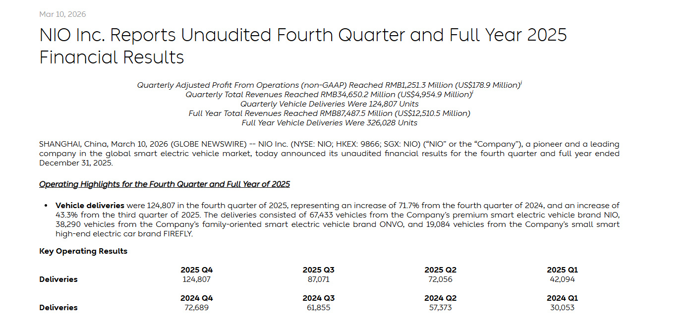 【蔚来四季度盈利12.5亿元2026年目标全年盈利!】蔚来(NIO)在2025