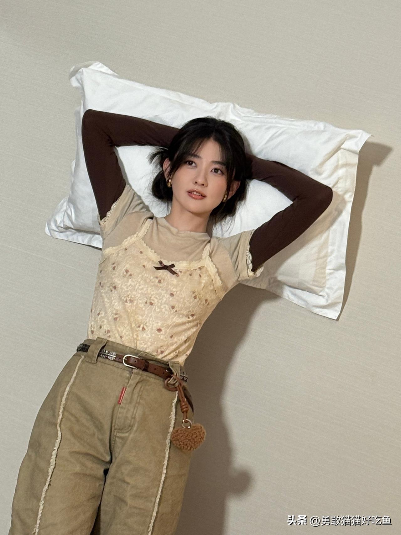刘亦菲这条裤子挺养生,毕竟降温了肚脐眼必须护住啊
