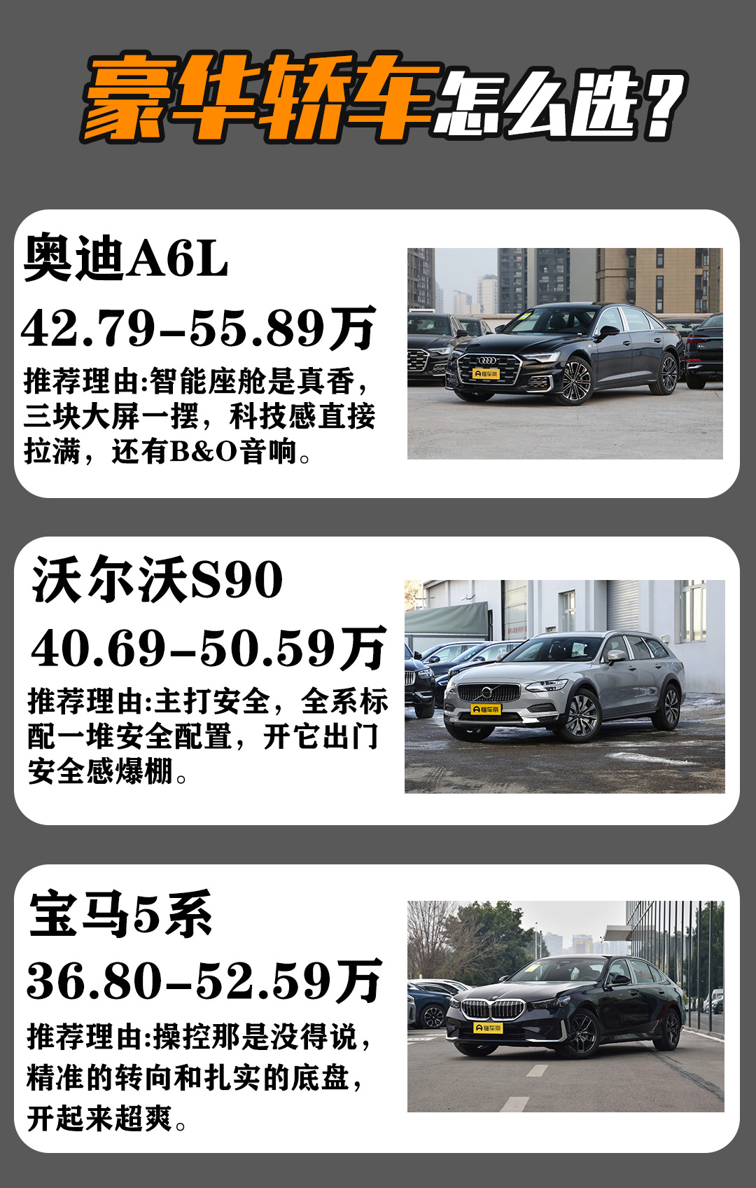 豪华品牌轿车,奥迪A6L、沃尔沃S90、宝马5系咋选?