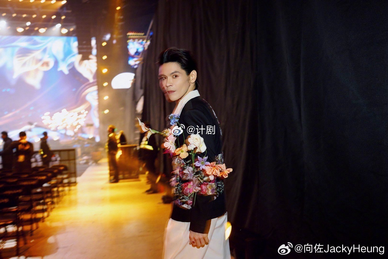 向佐腰间插了一圈鲜花 点看向佐这身造型被惊艳到了,腰间环绕一圈鲜花的创意确实少见。把时尚玩出新花样,这种打破常规的思路还挺有意思的。