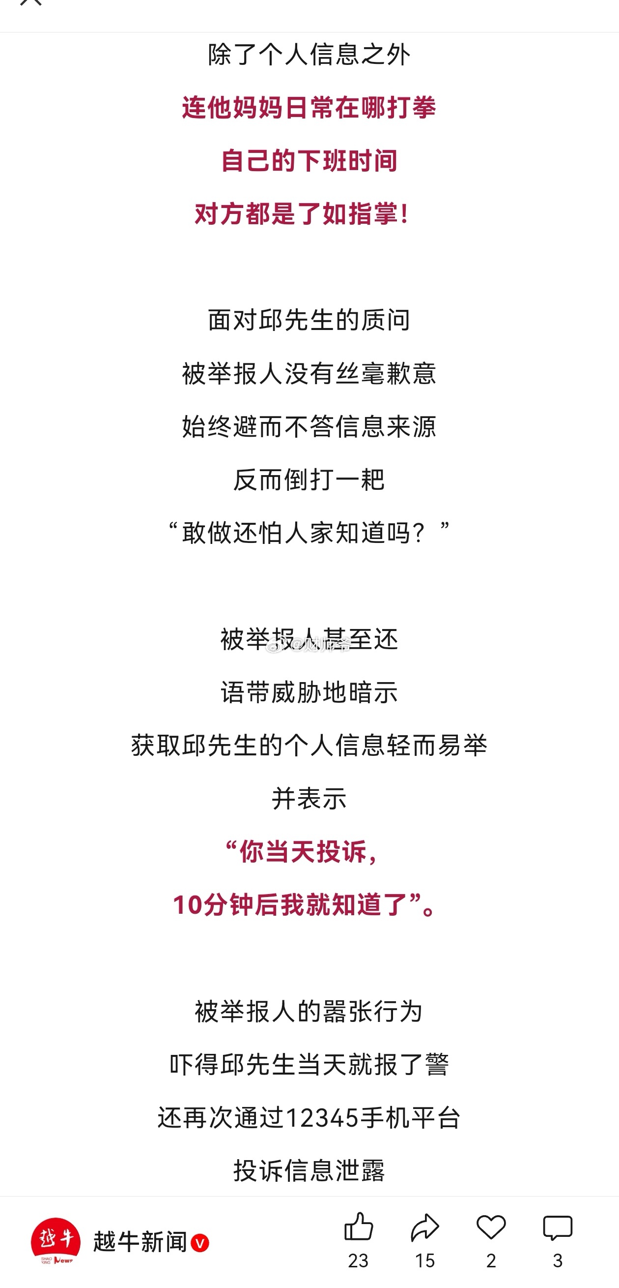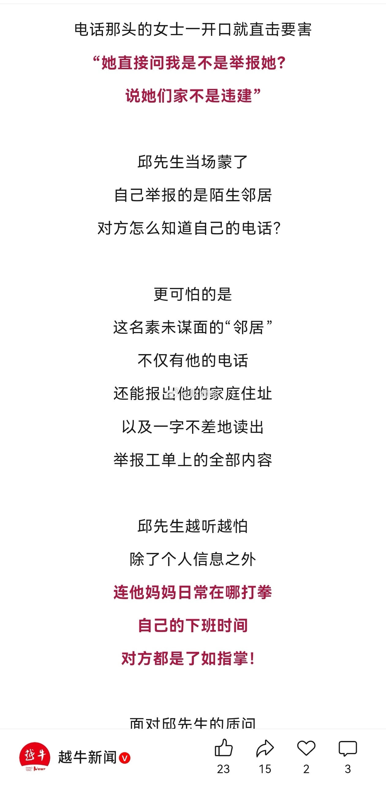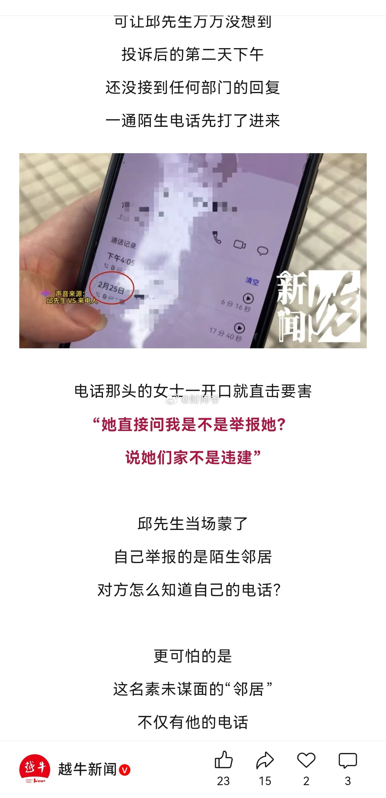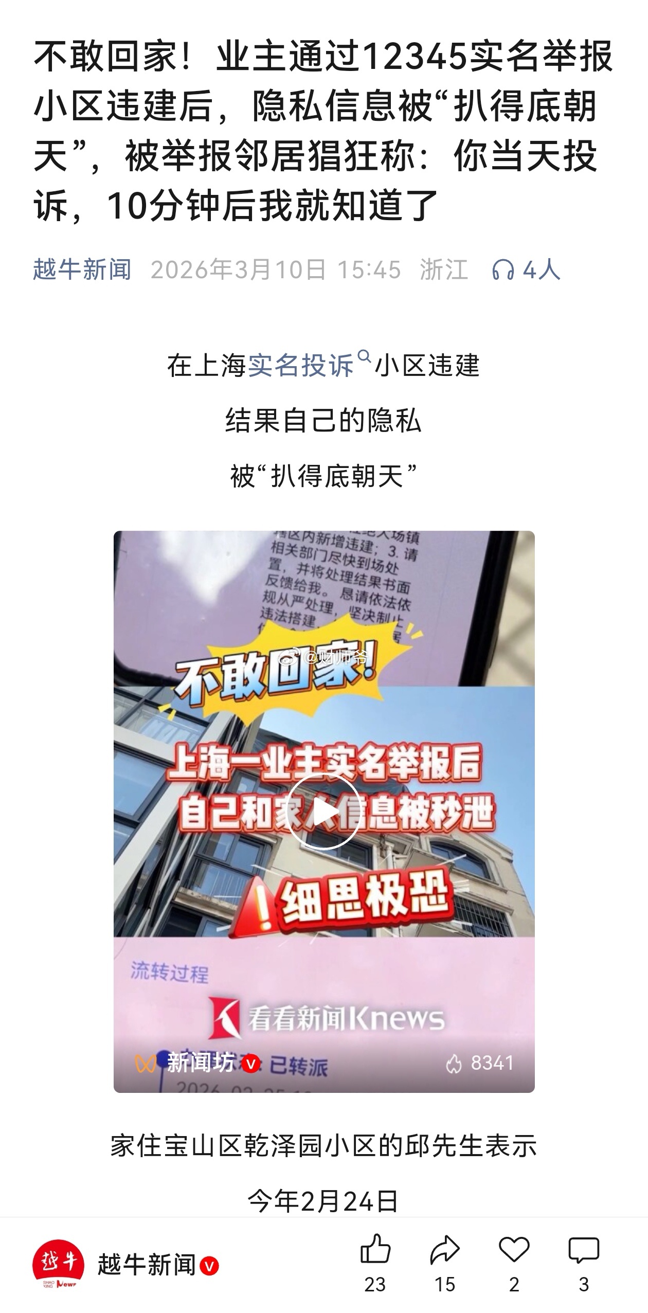 【这条新闻可不是小事!业主通过12345实名举报小区违建后,隐私信息被“扒得底朝天”,被举报邻居猖狂称:你当天投诉,10分钟后我就知道了】这可不是小事!又到了考验政府公信力的时候!而且这可是上海!举报者的信息是怎么被泄露出去了?哪个环节出了问题?被举报者是怎么拿到信息的? 背后又有哪股势力在跟人民群众作对?