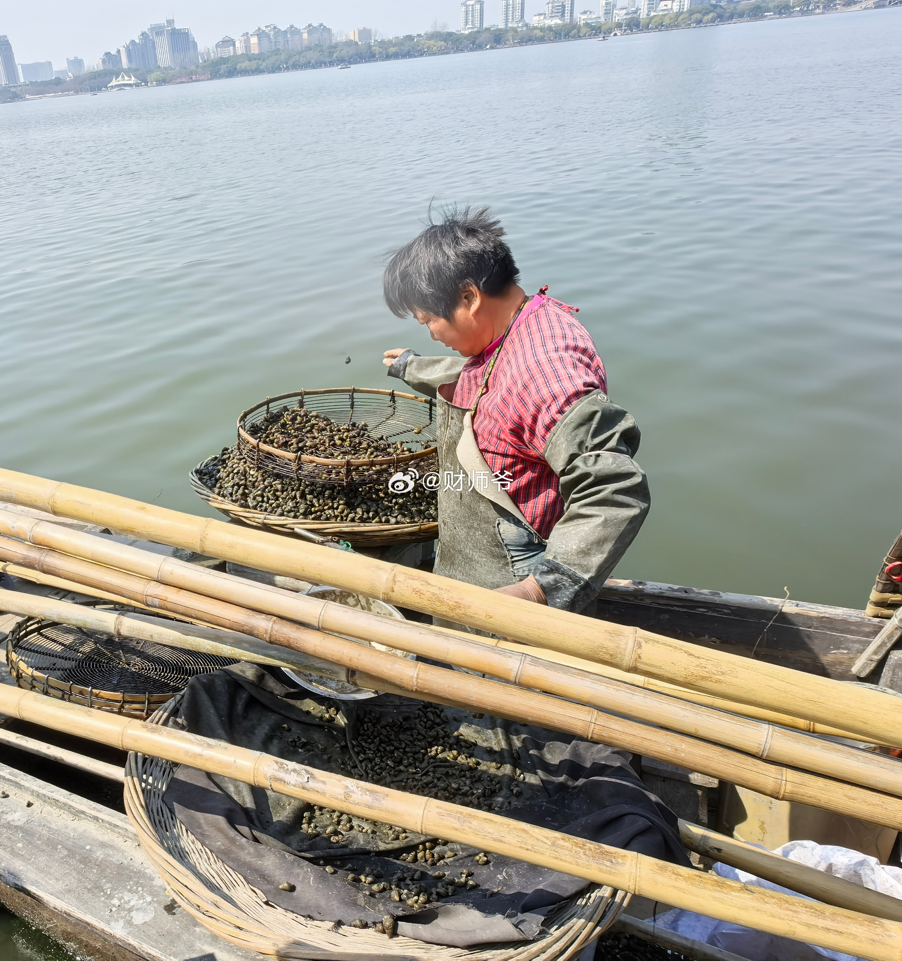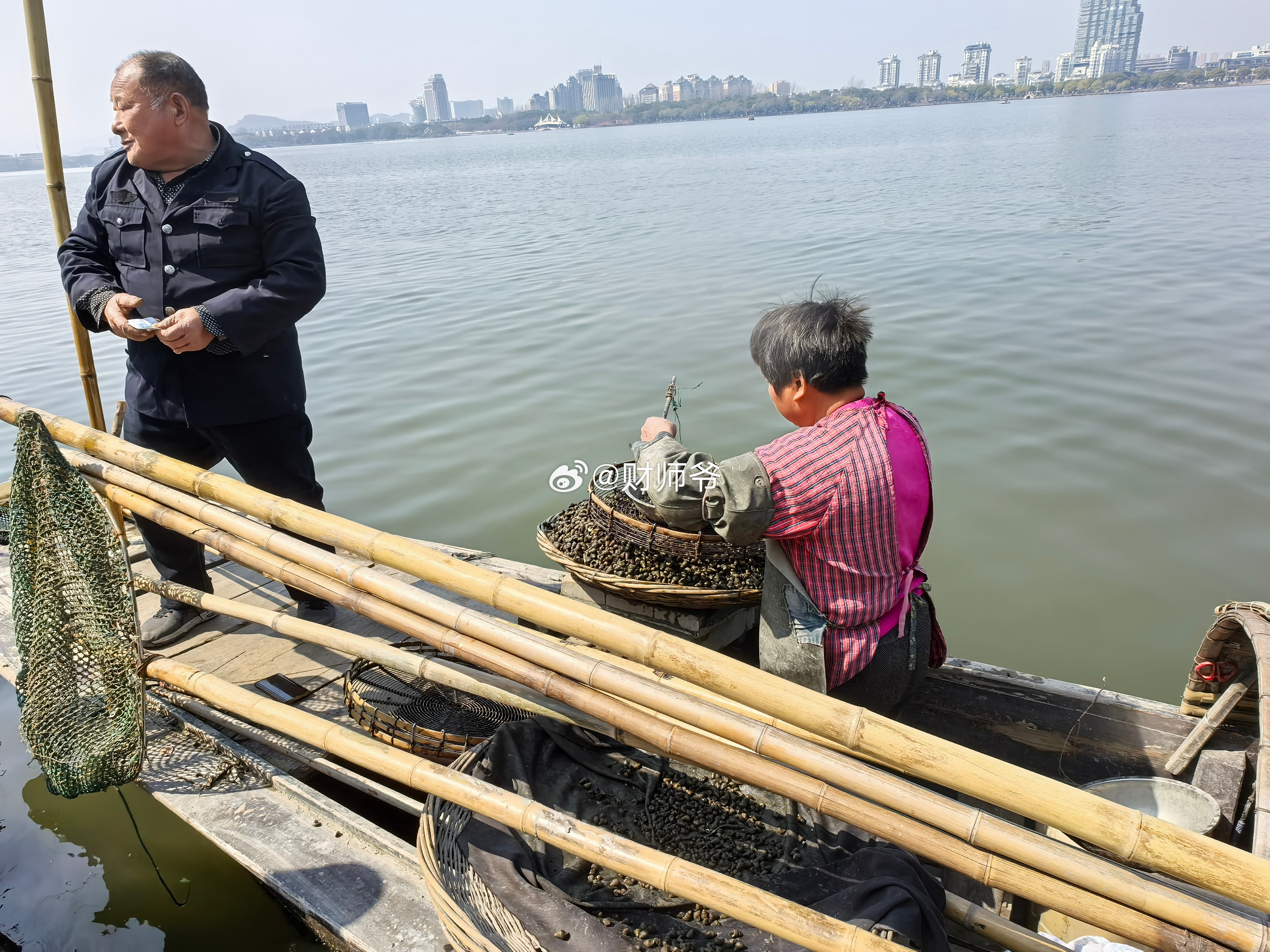 瓜渚湖的鱼贩——湖里现摸上来的螺蛳10元三斤,很实惠。渔老大说,这一片他们承包了,5年200多万。我的日常plog 绍兴·瓜渚湖・北岸公园