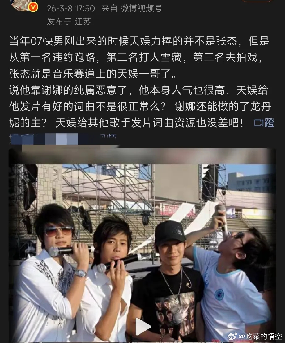 说什么因为前三名一个跑路,一个打人,一个拍戏,天娱才力捧的张杰,跟谢娜关系不大。