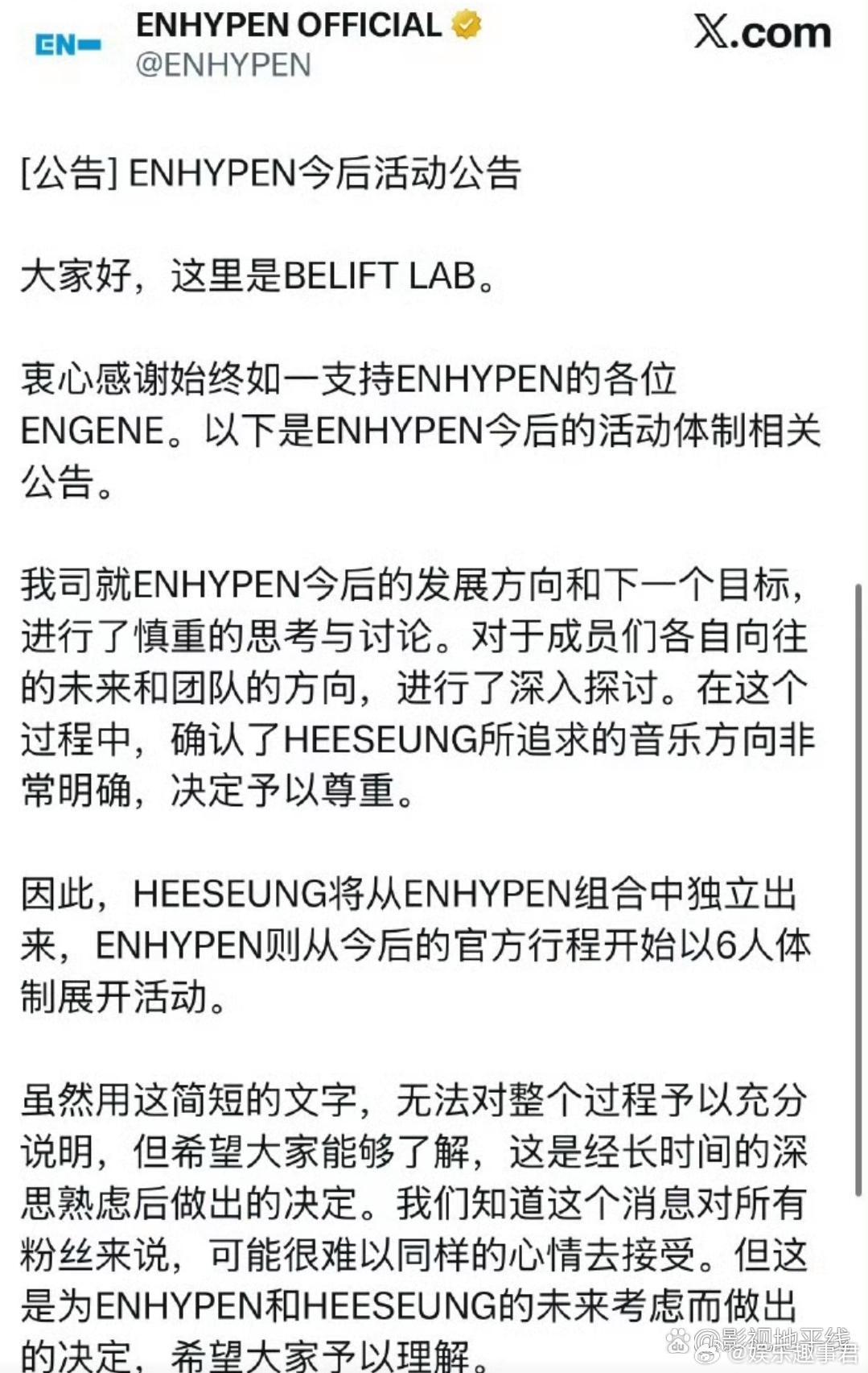 李羲承退队10日,ENHYPEN发布公告宣布李羲承退团,组合将以六人体制展开活动。“虽然用这简短的文字,无法对整个过程予以充分说明,但希望大家能够了解,这是经长时间的深思熟虑后做出的决定。”