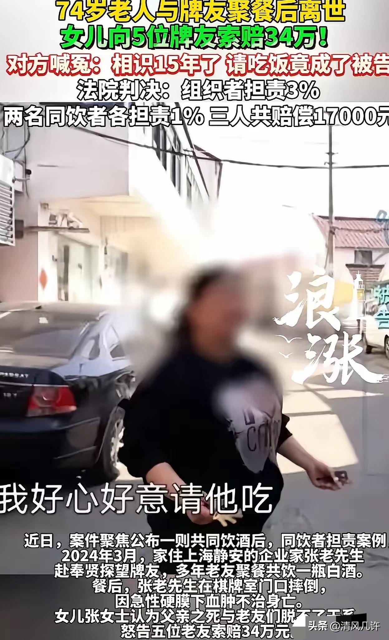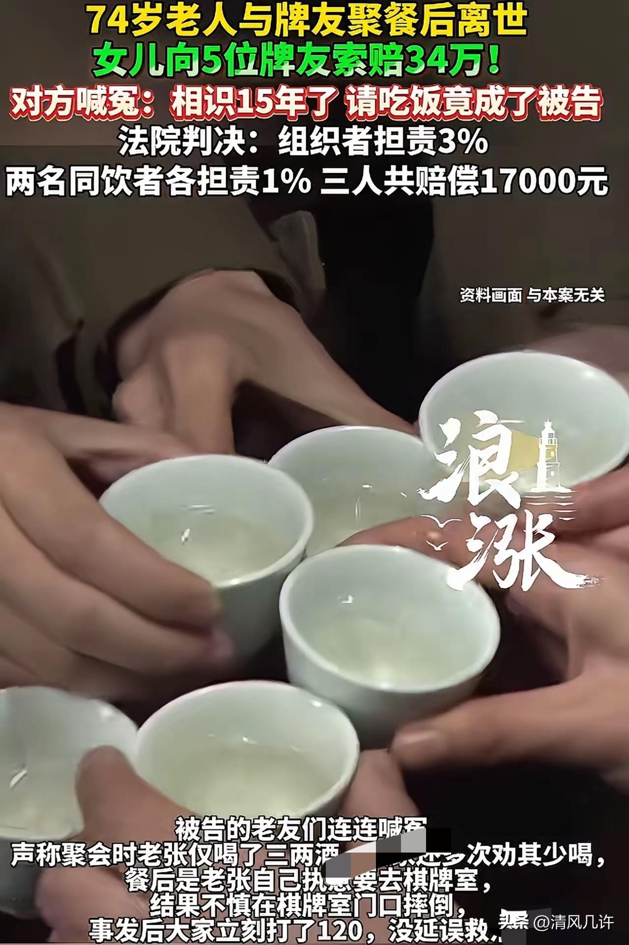 上海,74岁老汉到牌友家中聚餐,席间,5位牌友均与老汉相识已有15年,感情非常好,几人共饮了一瓶白酒。完事后,有人提议去玩几把,大家一拍即合,老汉也跟着去了。谁知,刚走到棋牌室门口,老汉脚下一滑,摔倒在地。几人见状吓坏了,赶紧叫了救护车,并将其送往医院。最终,抢救无效,不幸离世。事后,老汉女儿认为,如果父亲不去参加聚餐,人还活的好好的!一气之下,将5位牌友告上法庭,索赔34万元。牌友委屈的说:我好心好意请他吃饭,每次来都热情招待,吃了还被你告!法院调查后,发现这样一细节,判决很意外。 这场悲剧的主角,是上海静安的74岁企业家张老先生,和奉贤区5位相识整整15年的牌友。 这15年里,他们从牌桌走到生活,谁家子女结婚、谁家身体抱恙,彼此都记挂着。张老先生退休后没别的爱好,就爱和老友们凑一桌打牌,每周都要聚上几次,赵女士作为组织者,更是把老张当成亲兄长对待,每次聚餐都会做他最爱吃的本帮菜,提前备好他爱喝的低度白酒。2024年3月的这场相聚,本是再寻常不过的老友小酌,谁也没料到会成永别。 聚餐当天,张老先生特意从静安驱车到奉贤,老友们早早备好了酒菜。 桌上摆着的是一瓶普通的白酒,几人边聊边喝,张老先生喝了约三两后,就有些脚步发飘。老友们看在眼里,纷纷劝他“老张,少喝点,你年纪大了,酒喝多了伤身体”,还给他夹了几口菜冲淡酒意,没人强行劝酒,更没人逼他多饮。 酒局结束时,天色已暗,赵女士提议“去棋牌室坐会儿吧,好久没摸牌了”,张老先生摆摆手说“行,走几步就到,活动活动”,完全没意识到自己酒后的状态有多危险。 牌友们骑着电瓶车,轮流载着张老先生往棋牌室赶。到了棋牌室门口,张老先生刚下车,脚下一软就直直摔了下去,后脑勺重重磕在地面。这一幕让牌友们瞬间慌了神,有人立刻掏出手机拨打120,有人蹲在地上查看他的状况,还有人赶紧联系棋牌室的工作人员帮忙照看。 从张老先生摔倒到救护车赶到,不过十几分钟,医护人员到场后立刻进行急救,随后将他送往奉贤区中心医院。当晚8点15分,张老先生被推进急诊室,可最终的诊断结果,让所有人都红了眼——急性硬膜下血肿,抢救无效离世。 张老先生的女儿张女士接到医院电话时,正在外地出差,连夜赶回上海的路上,她脑海里全是父亲的模样。 父亲身体向来硬朗,还经营着一家小公司,怎么会突然就没了?在医院里,她从医护人员口中得知父亲是在棋牌室门口摔倒的,可牌友们却含糊其辞,只说“送到家附近了,不小心摔了”。 张女士心里的疑团越滚越大,等她调取了警方监控,看到父亲被送到棋牌室门口的画面时,悲痛瞬间变成了愤怒。她认定,是牌友们没把父亲安全送回家,是他们没尽到看护责任,甚至还故意隐瞒摔倒地点,才导致父亲错过了最佳抢救时间。 带着这份撕心裂肺的悲痛,张女士将5位牌友全部告上法庭,索赔34万元。她在法庭上红着眼眶说:“我父亲一辈子谨慎,要是没去这场聚餐,就不会喝酒,也不会去棋牌室,更不会摔死。他们都是责任人,必须为我的父亲负责。”可被告席上的5位牌友,一个个哭得比谁都伤心。 赵女士抹着眼泪说:“我们认识15年,我把他当亲哥,每次他来,我都是倾其所有招待,怎么可能害他?那天他喝了三两酒,我们劝了无数次少喝,是他自己要去棋牌室,我们也是好心送他过去,怎么就成了被告?”另一位牌友也补充道:“我们第一时间打了120,全程陪着去医院,垫付了检查费,怎么可能延误抢救?这简直是天大的冤枉。” 法院的审理,抽丝剥茧还原了所有真相。法官调取了医院的接诊记录、警方的监控视频,还对张老先生的身体状况进行了法医鉴定。 关键细节逐一浮出水面:张老先生的死亡原因是摔倒撞击导致的急性硬膜下血肿,体内的酒精仅让他反应能力略有下降,并非致死主因;他仅喝了三两白酒,远未达到醉酒程度,牌友们确实多次劝阻;从他19点10分摔倒,到20点15分送医,仅间隔一小时左右,完全符合正常路程耗时,所谓“延误两小时抢救”纯属子虚乌有;更重要的是,牌友们其实并不知道张老先生的具体住址,这也是他们没能送他回家的核心原因。 同时,法院还厘清了责任边界:提前离场的67岁吴阿婆和未参与棋牌活动的陈先生,因不在事故现场,被排除所有责任;而张老先生作为完全民事行为能力人,明知自己酒后不宜外出,却执意前往棋牌室,对自身安全未尽到注意义务,理应承担主要责任。 最终,上海奉贤区人民法院柘林人民法庭作出判决:组织者赵女士承担3%的责任,两名陪同前往棋牌室的牌友各承担1%的责任,三人合计赔偿17000元,其余两位牌友无需担责。这个判决,既没有偏袒悲痛的家属,也没有苛责无辜的老友,在法理与人情之间找到了最精准的平衡。 各位读者你们怎么看?欢迎在评论区讨论。