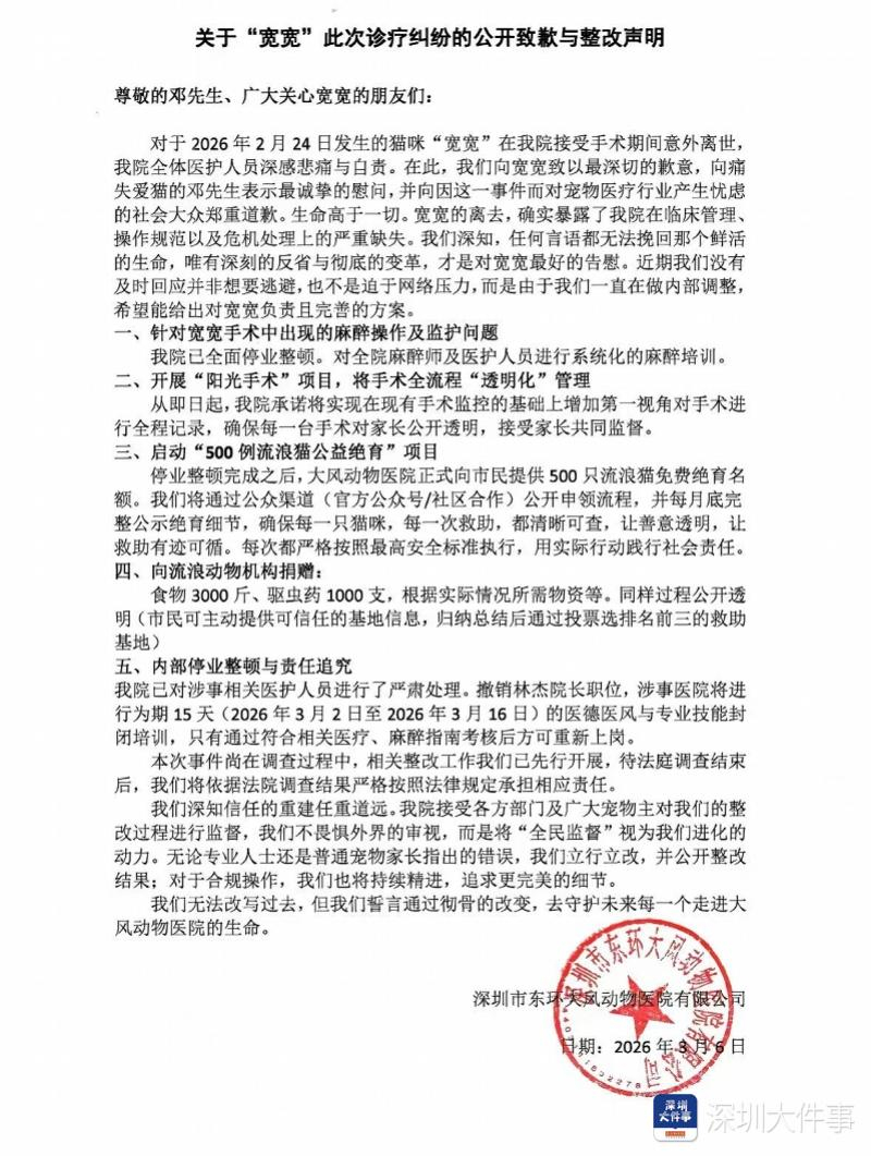 3月7日,针对“宽宽”的诊疗纠纷,涉事医院于网络平台发布了道歉与整改声明。其中提到,针对宽宽手术中出现的麻醉操作及监护问题,医院已全面停业整顿,对全院麻醉师及医护人员进行系统化麻醉培训。医院对涉事医护人员进行处理,撤销现任院长职位,涉事医院将进行为期15天的医德医风与专业技能封闭培训,院方将依据法院调查结果承担相应责任。
