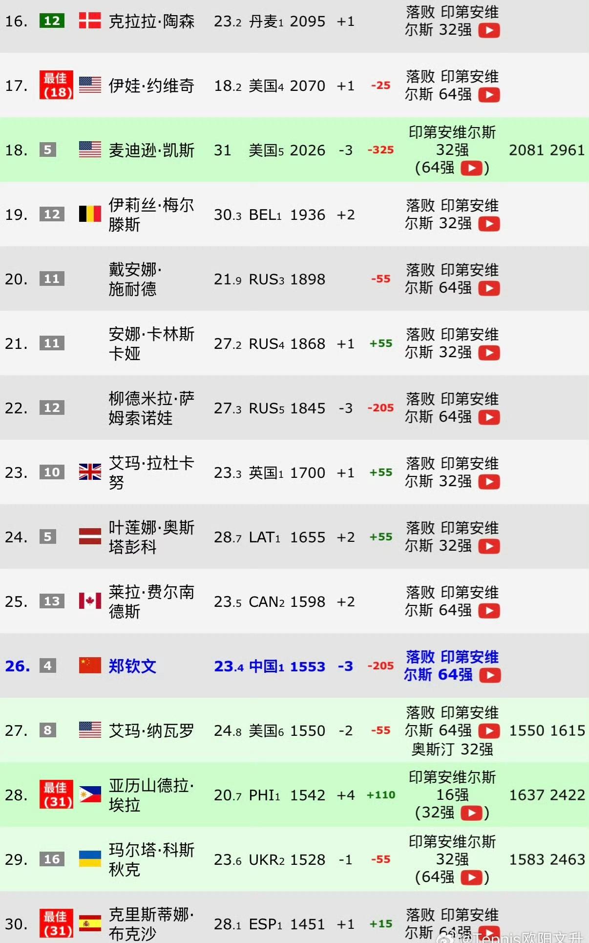 WTA即时排名更新,郑钦文马上难保亚洲一姐位置。 萨巴伦卡稳坐世界第一宝座,莱巴金娜有机会反超斯瓦泰克。 小米辣扣除卫冕冠军巨分,排名居然还在前十。 烂白菜稳得很,突然就跃居第八了。