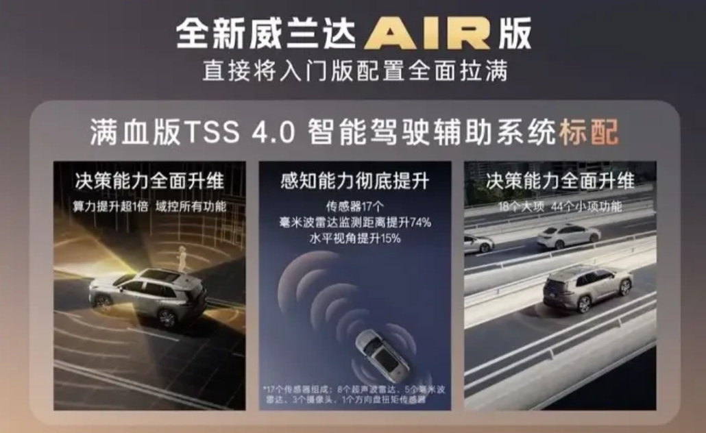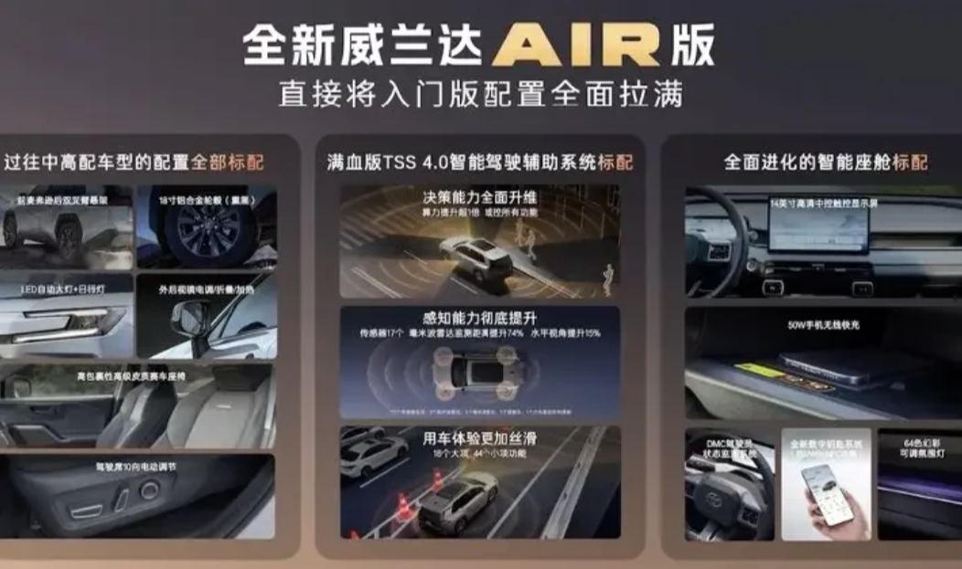 想买车的先别急,先把工信部的消息看明白: 1..新能源汽车购车优惠再调整,叠加最高能省3.5万元。 2.车险新规全面落地,最重要的是车主能省不少钱。 3.电车的可靠性试验要进行1.5万公里,才能上市。 广汽丰田威兰达AIR版硬生生把合资SUV的价格打到到13.78万元,直接卡住了国产SUV的脖子。广汽丰田威兰达AIR版,10多万的价格,就能买到合资车,这价格杠杠的。 威兰达AIR版采用北美全球车的外观,大气耐看,更重要的是,它入门就高配,两驱车就配限滑差速器,越野性能超好。 丰田智能驾驶辅助系统,实现L2+级的智能辅助驾驶,24个传感器、830万的前向摄像头,以及280米的前向雷达检测,让车主能及时掌握路况信息,有效避免加塞、并线等驾驶行为,行车更加安全。 升级的底盘更是让车主满心欢喜,采用前麦弗逊后多连杆独立悬架结构,悬挂安装点刚性超30%,过减速带、乡村道路,稳定性堪比豪车。车辆隔音更是超过高一级别的SUV,更安静、更静谧。