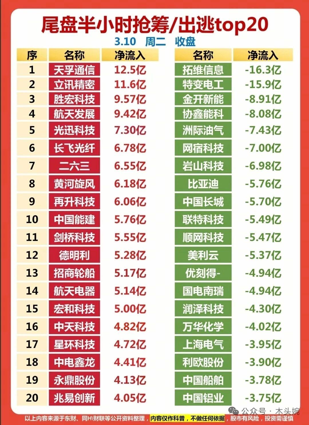 3月10日周二复盘整理:主力资金动向+尾盘抢筹名单+暗盘资金数据等等。 (1)资金动向TOP20出炉!天孚通信、胜宏科技、立讯精密领衔净流入榜,算力、光通信赛道获资金热捧;特变电工、拓维信息、金开新能则位列净流出前列,高低切迹象明显。 (2)尾盘抢筹动向:天孚通信、立讯精密狂揽超10亿净流入,算力、通信设备板块尾盘获资金集中抢筹;拓维信息、特变电工则遭超15亿资金出逃,高位股尾盘承压明显。 (3) 主力偷偷买了这些! 大资金暗盘流入CPO概念成绝对主力!胜宏科技、亨通光电暗盘资金超140亿,主力疯狂锁筹;光通信、算电协同板块获重金追捧,光模块赛道成近期最强风口; ⚠️ 以上仅为数据参考,不构成投资,资料全网公开,不对任何人构成投资建议。