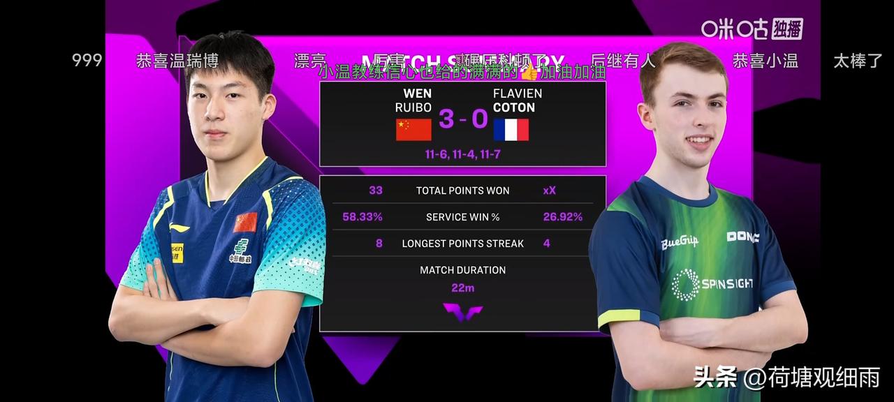 温瑞博,充分发挥自己的优势,敢拼敢打,酣畅淋漓,状态满满,3:0法国科顿,晋级重庆冠军赛男单1/16。 温瑞博是国乒男队的希望之星,有速度有爆发力,有想法有办法,落点拉的开,发球变化多,接发球敢上手,整场比赛发挥近乎完美,假以时日精雕细琢一番,必是国乒核心主力。国乒小将温瑞博 国乒小将温瑞博 WTT重庆夺冠 国乒温瑞博 温瑞博男单亚军 温瑞博亚军 温瑞博蒯曼