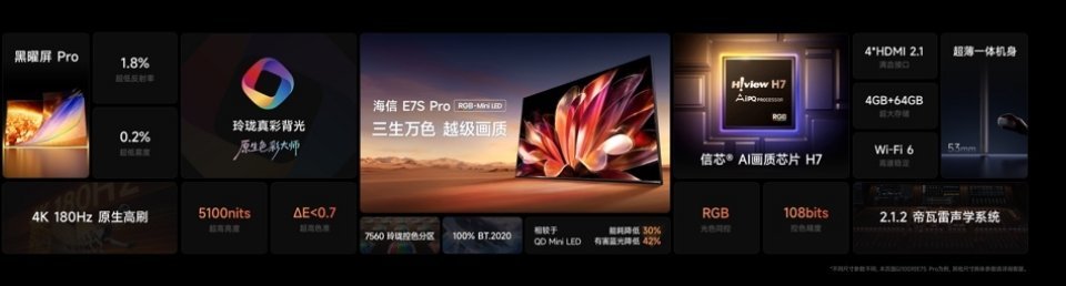 3月10日,海信发布了RGB-Mini LED电视E7S Pro,含65/75/85/100英寸四尺寸,以技术突破成为2026旗舰电视版本答案,推动行业迈入RGB-Mini LED新时代。这款电视核心搭载玲珑真彩背光与信芯AI画质芯片H7双引擎,从底层重构显示技术。玲珑真彩背光实现光源等四重重构,全自研车规级RGB发光芯片让三原色独立直出,达成100% BT.2020原生色域、△E<0.7超高色准,7560控色分区+5100nits超高亮度实现1区控色>3区控光,还通过特殊光学设计降低60%光晕,车规级的发光芯片,有效使用寿命突破16万小时,信芯H7作为独立高算力芯片,以108bits控色精度实现像素级光色同控,搭配多项AI算法,还能提升低清画质、强化画面沉浸感。海信E7S Pro全维配置拉满,屏幕采用黑曜屏Pro,1.8%超低反射率+0.2%超低雾度,实现3倍抗反光,3倍黑度的行业领先表现,搭配原生4K 180Hz高刷、330Hz倍频刷新模式和四路满血HDMI2.1,游戏体验拉满。声学上联合帝瓦雷打造2.1.2声道系统,165W功率+60Hz低音下潜,带来Hi-End级的空气推动感,相当于为用户标配了一台国际顶尖的Hi-Fi音响。设计上53mm超薄机身+8mm贴墙设计,融合美学与实用。同时,它适配多元场景,光影妙控台支持51维色彩调节,炫彩刮削海报墙智能管理影视资源,游戏模式有专属优化,还搭载Dolby Vision 2等前沿技术,4GB+64GB存储满足多样需求。健康环保层面,硬件级原生低蓝光让有害蓝光降低42%,整机功耗降30%,无镉零污染更绿色。价格方面,海信E7S Pro首发诚意满满,叠加优惠至高3000元,65英寸6999元起,还推出限量投影仪,免费安装,3年质保等四大首发特权。此次新品发布,标志着海信RGB-Mini LED技术规模化普及,也重新定义了主流旗舰电视标准,推动显示行业升级换代。