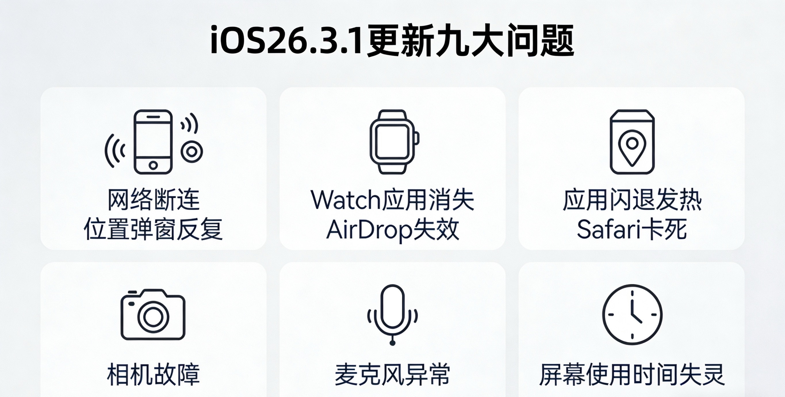 全网集中吐槽iOS26.3.1九大痛点:网络、生态联动、系统流畅度、硬件功能全线出问题。跑分好看但实际体验差,发热续航拉胯。已更的可尝试重启还原,没更的优先观望,等官方修复推送。iOS26.3.1更新九大问题吐槽
