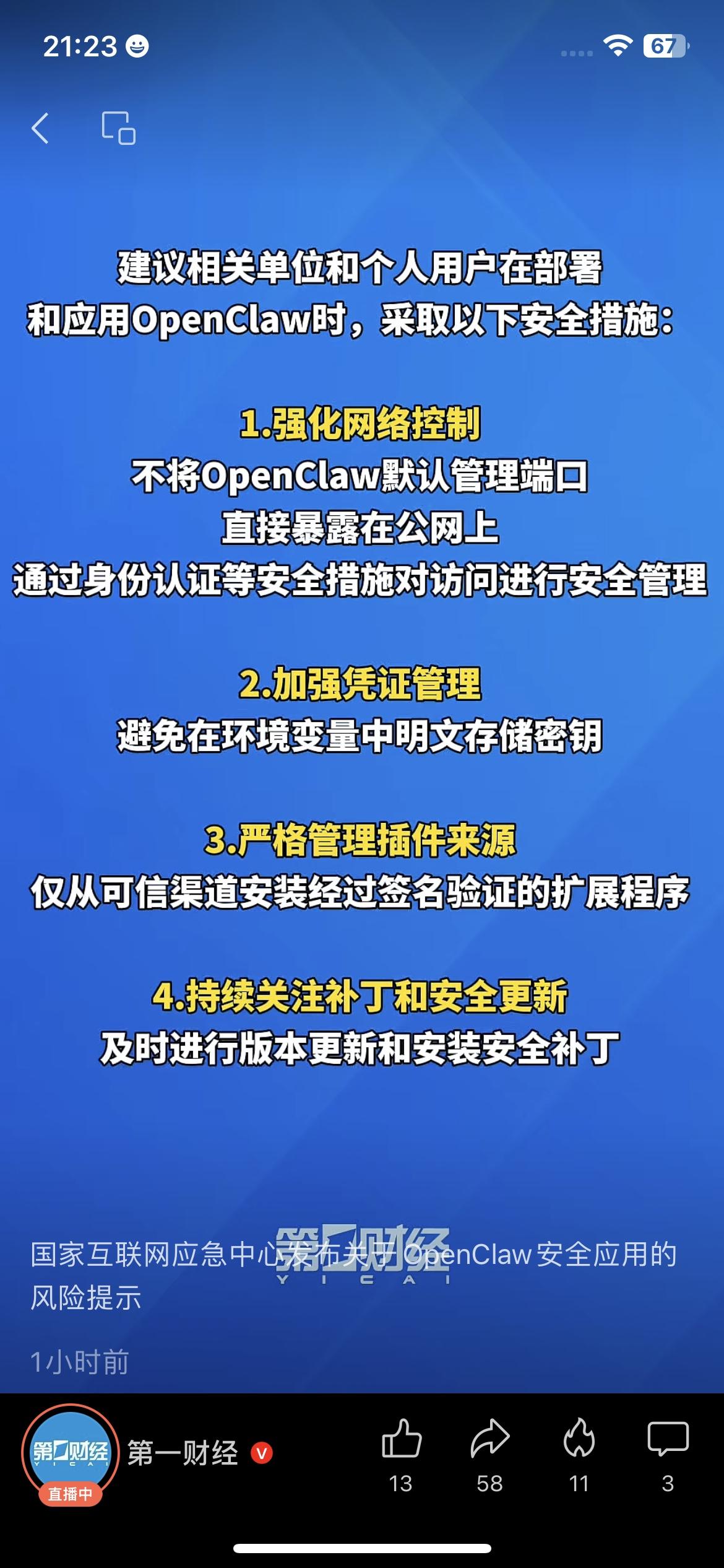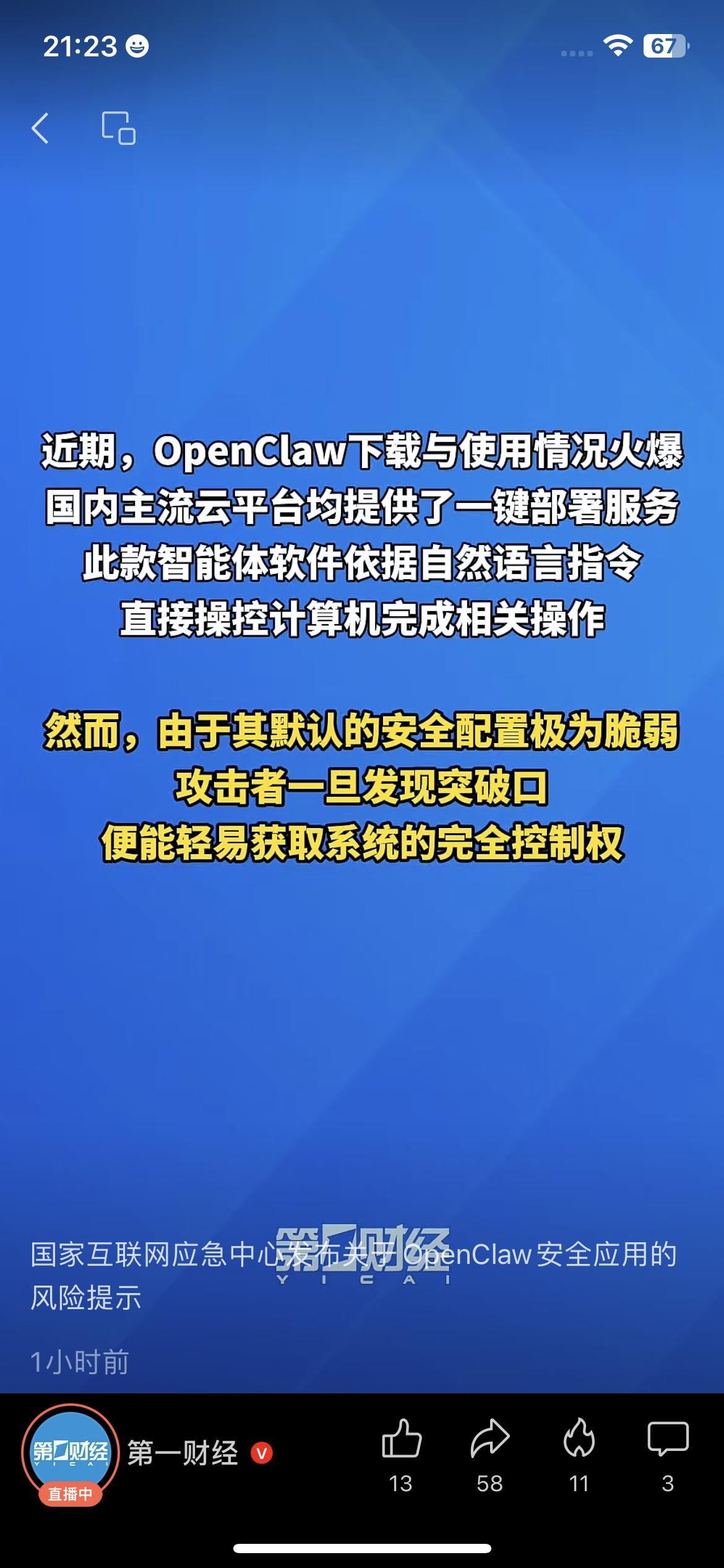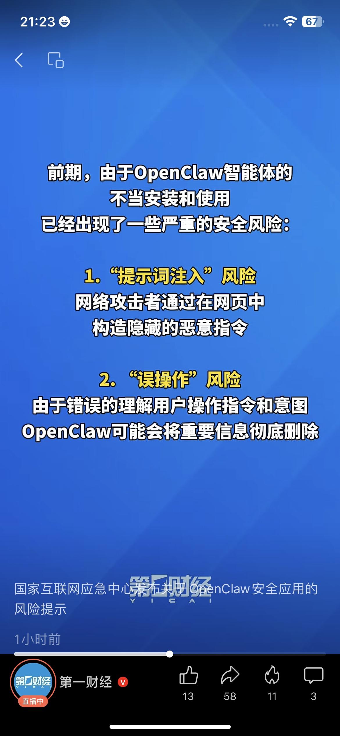 紧急预警!国家互联网应急中心发布OpenClaw安全应用风险提示,这款近期爆火的智能体,两大致命风险必须警惕! ❌ 提示词注入风险:看似正常网页藏恶意指令,诱导OpenClaw执行,攻击者可获取系统控制权,隐私文件全暴露; ❌ 误操作风险:智能体指令理解偏差,可能误删重要文件,数据一旦删除几乎无法恢复。 OpenClaw靠自然语言操控电脑,但默认安全配置极脆弱,普通用户切勿盲目一键部署! OpenClaw风险 AI安全 互联网应急中心