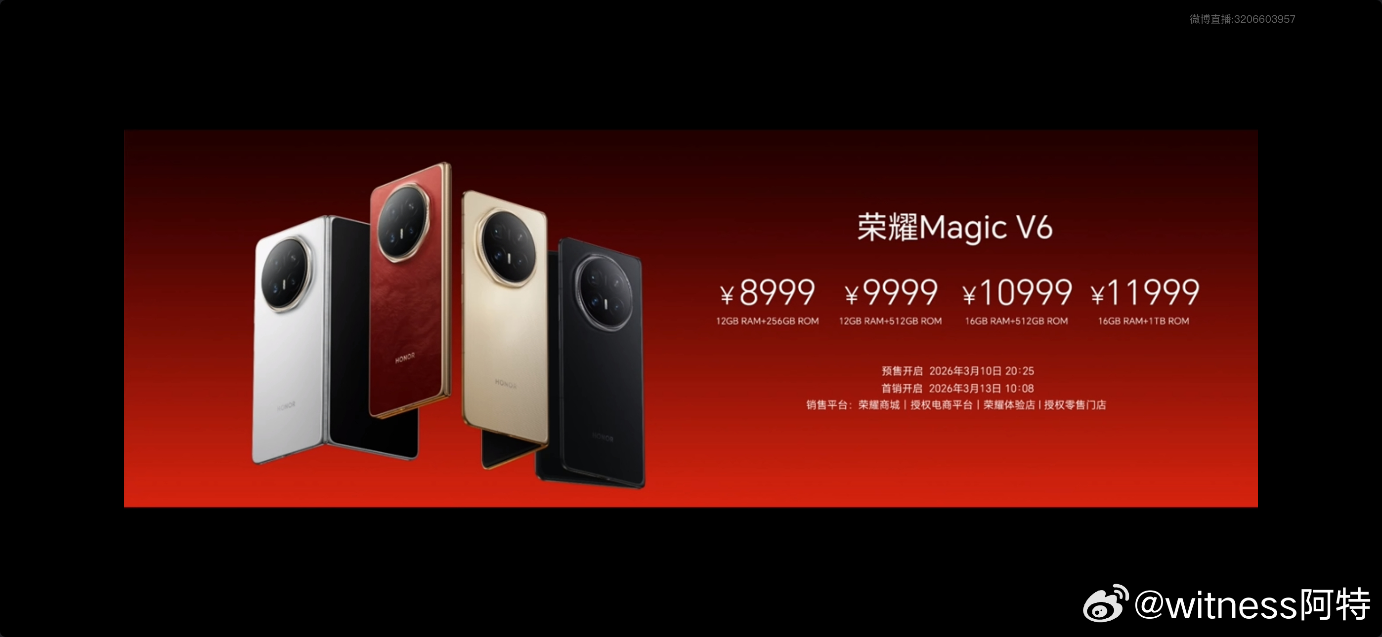 荣耀magicv6 满血旗舰大满贯!12+256g版本 899912+512g版本 999916+512g版本 1099916+1tb版本 11999荣耀magic v6这台折叠屏薄至8.75mm,这不是荣耀的极限,是Type-C充电口的极限!真正做到了又薄,又强,续航拉满!荣耀