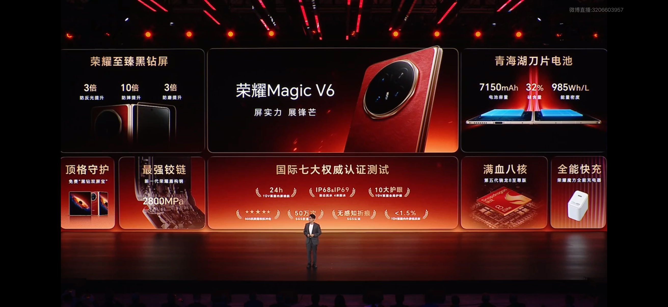 荣耀MagicV6太能整活了 看完这次荣耀Magic V6发布会的第一感觉,就是啊耀是真的很敢玩。一般手机发布会都是讲参数、跑分、PPT,这次直接上实测综艺。外屏拿电钻直接磨就离谱...内屏更狠,现场直接上手敲,还有吊人、泡水、拉飞机这些环节。